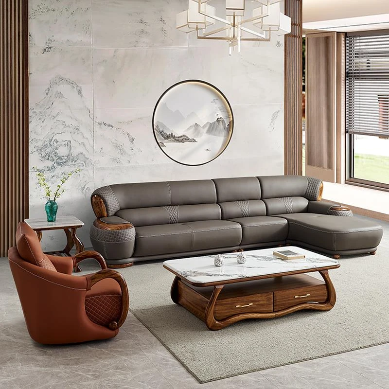 Luxury Modern Chinese Style Ukin Wood and Genuine Leather Corner Sofa - High-End Villa Living Room Couch with Top Layer Cowhide Shell Design