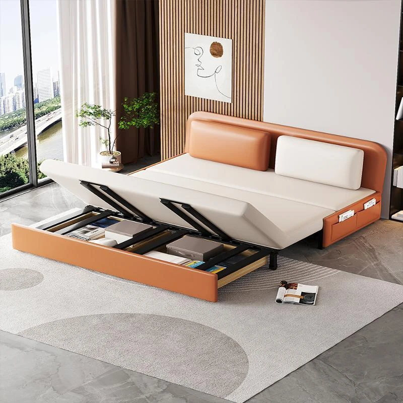 Vintage Waxed Leather Sofa Bed - Multi-functional, Expandable Design for Small Living Rooms - Perfect for Home Use, Stylish and Space-Saving Double Bed