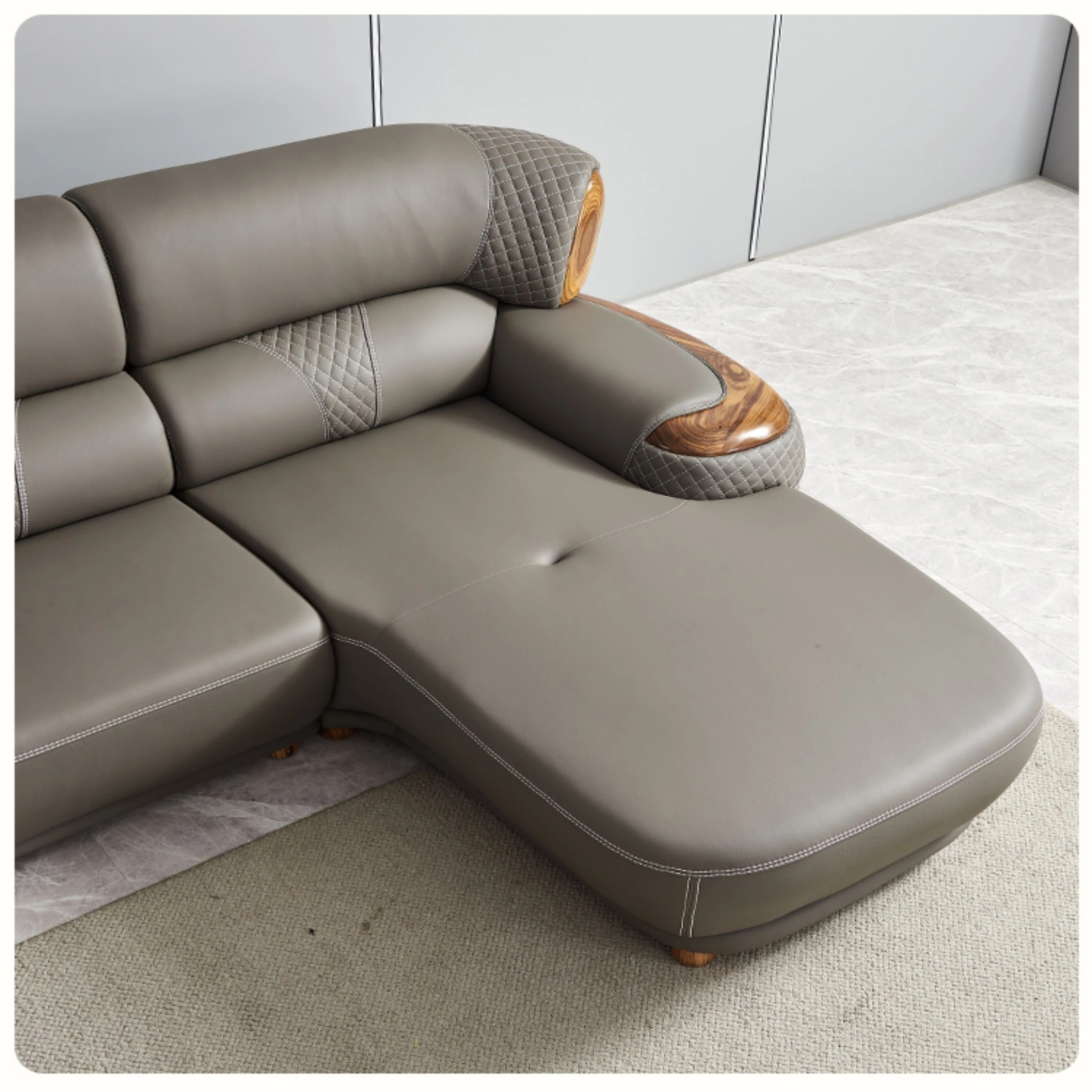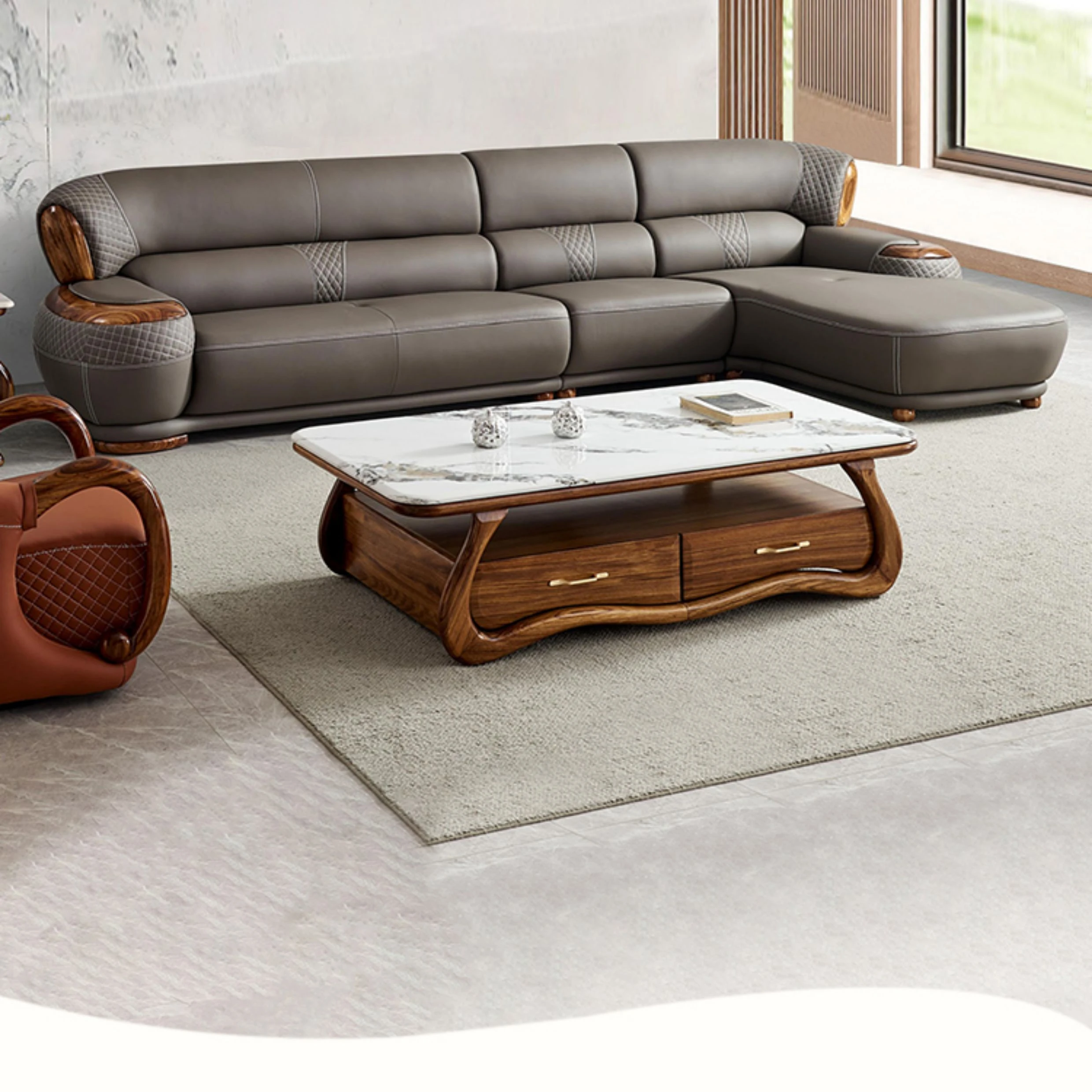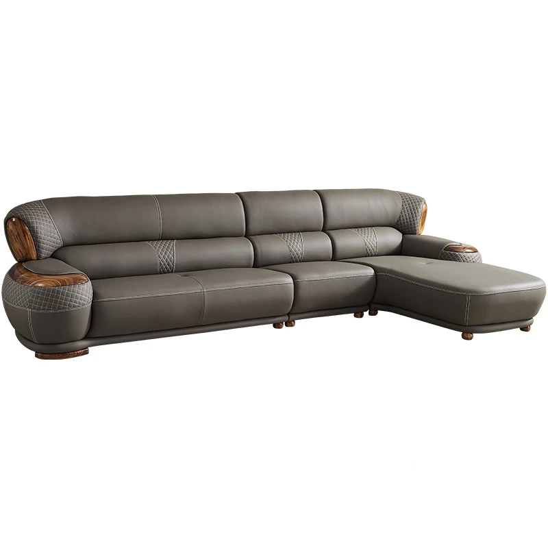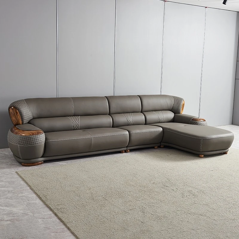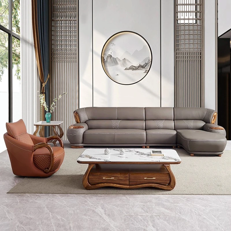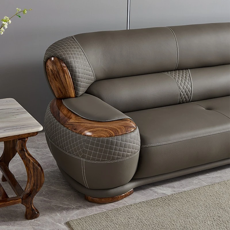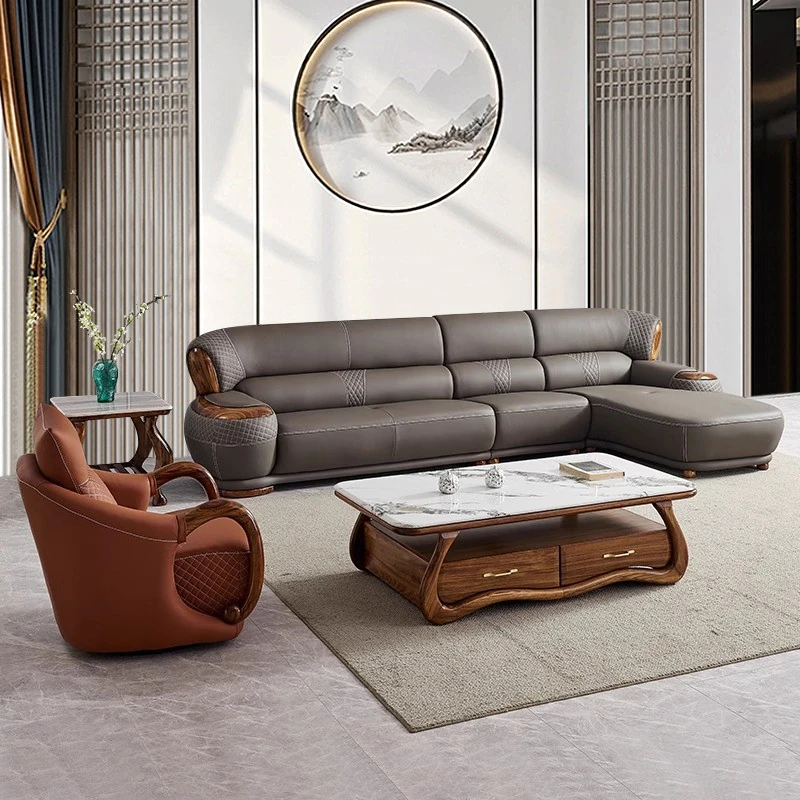 Luxurious New Chinese Style Black Walnut Leather Sofa - Premium Top Grain Cowhide for Spacious Living Rooms, Elegant European Solid Wood & Leather Design