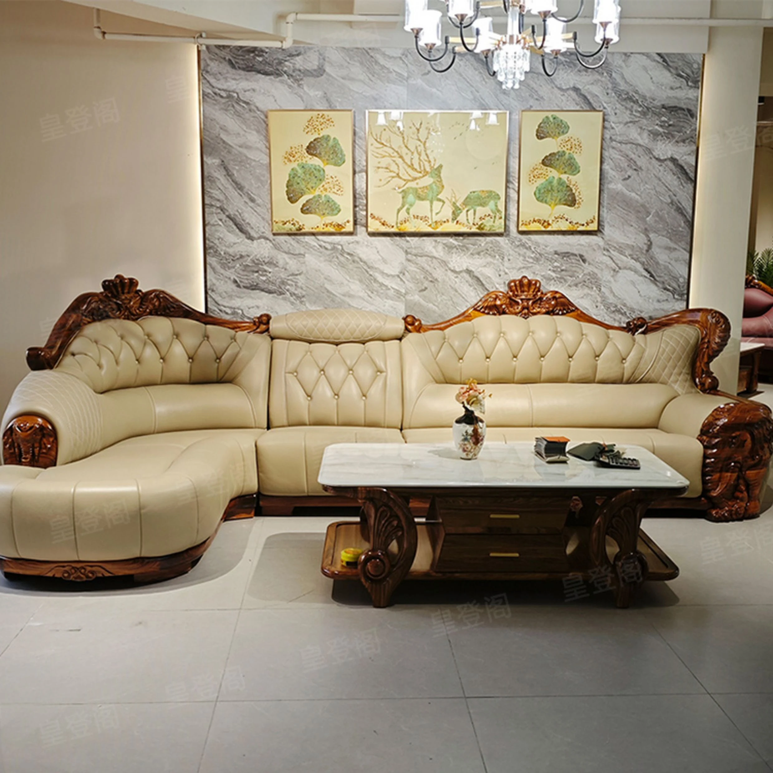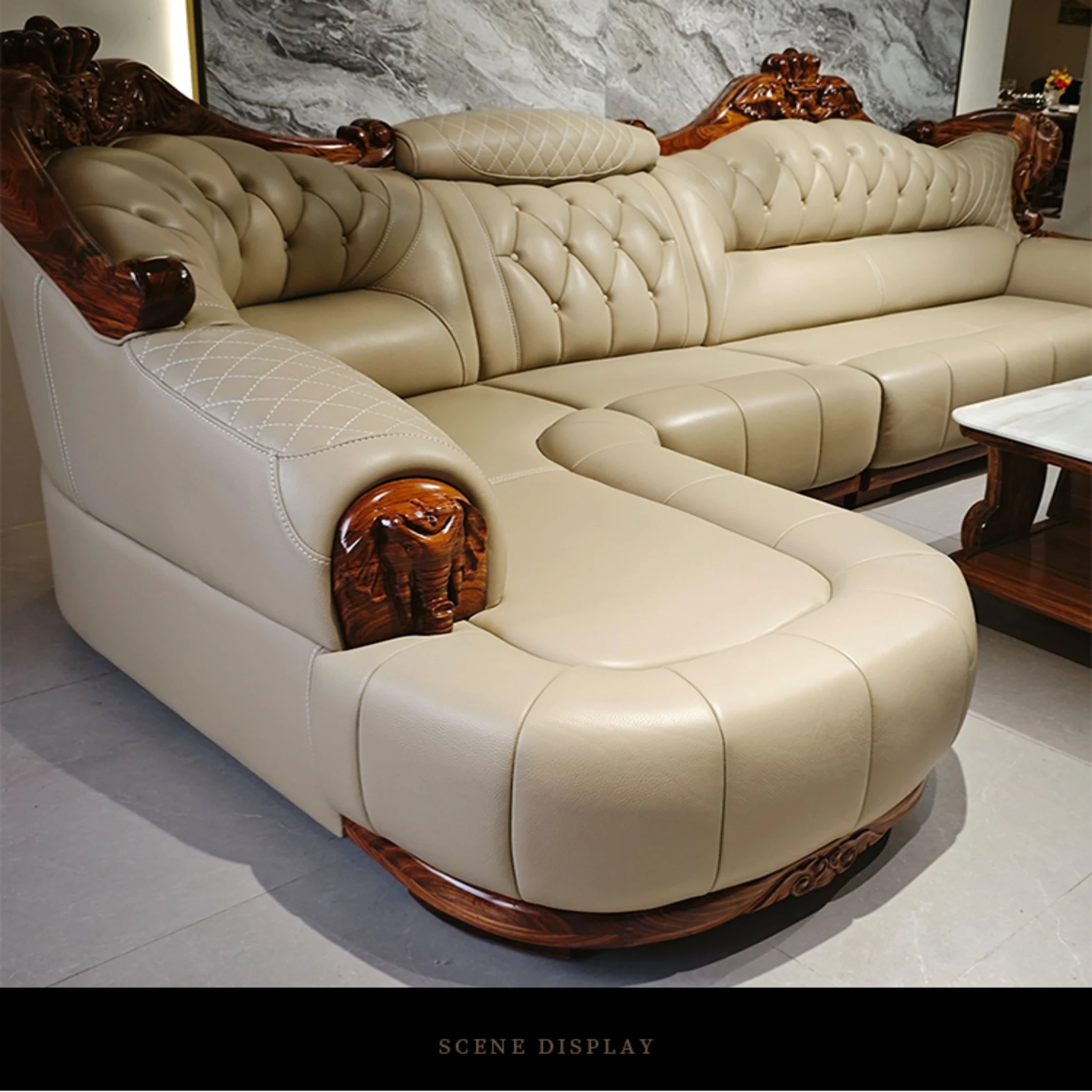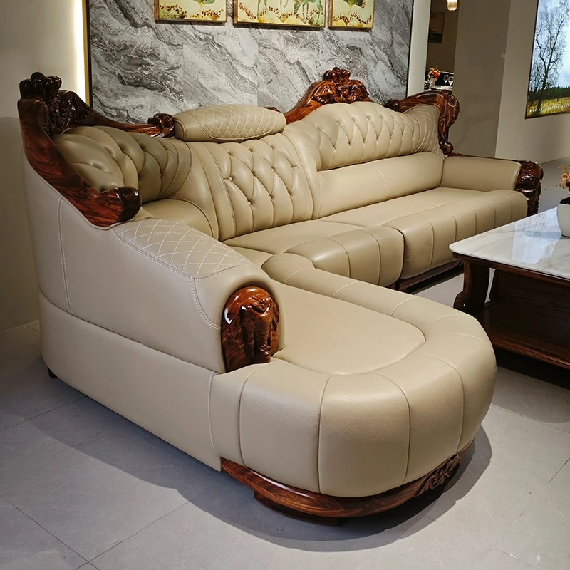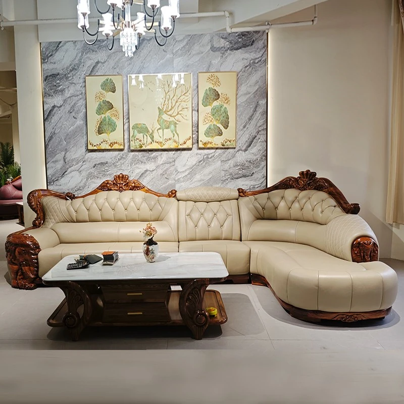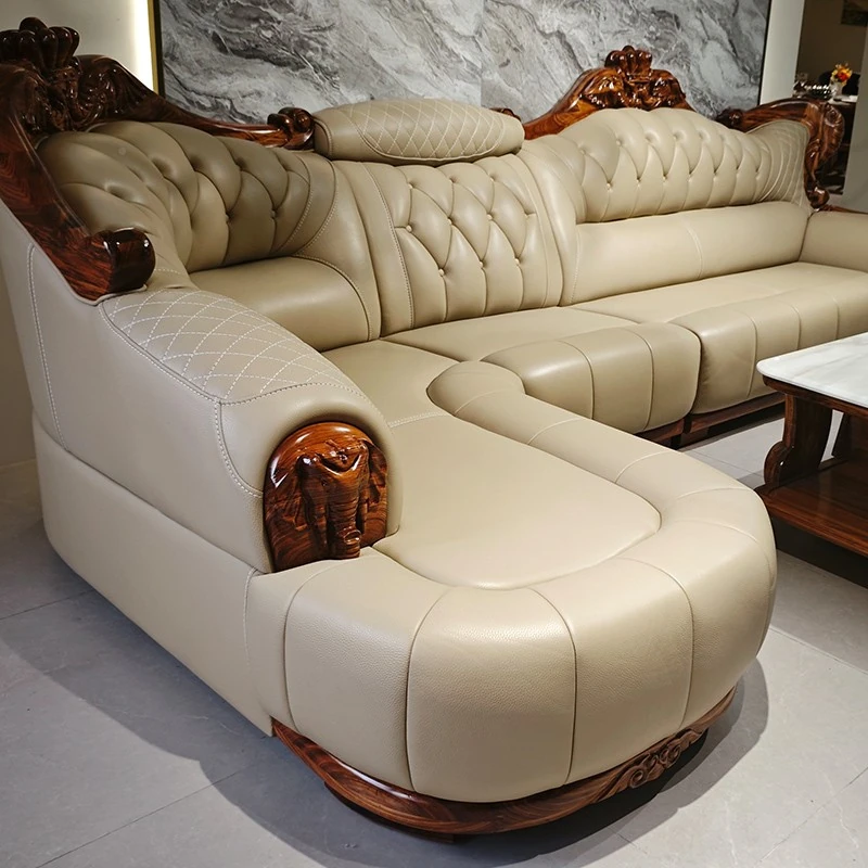 Luxury Chinese-style Solid Wood Elephant Crown Corner Sofa for Large Homes - Elegant Villa Chaise Lounge with High-Quality Leather Upholstery
