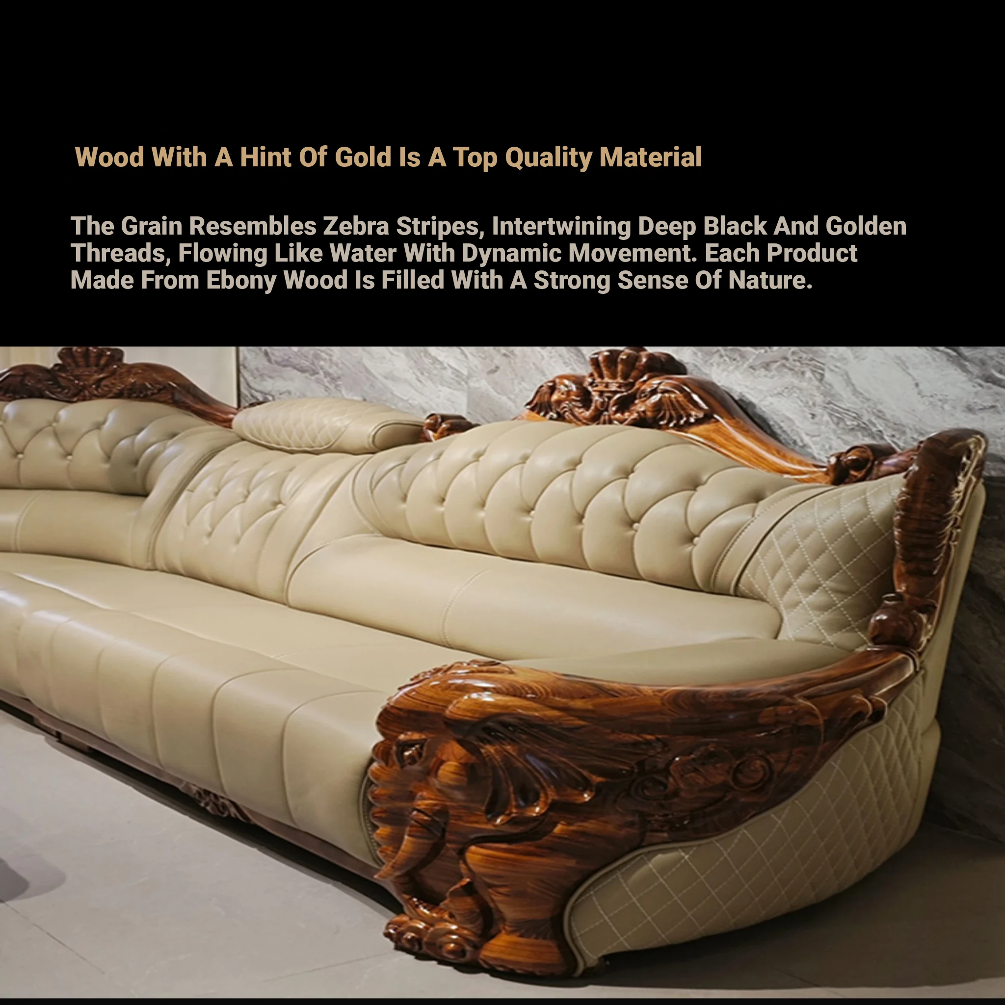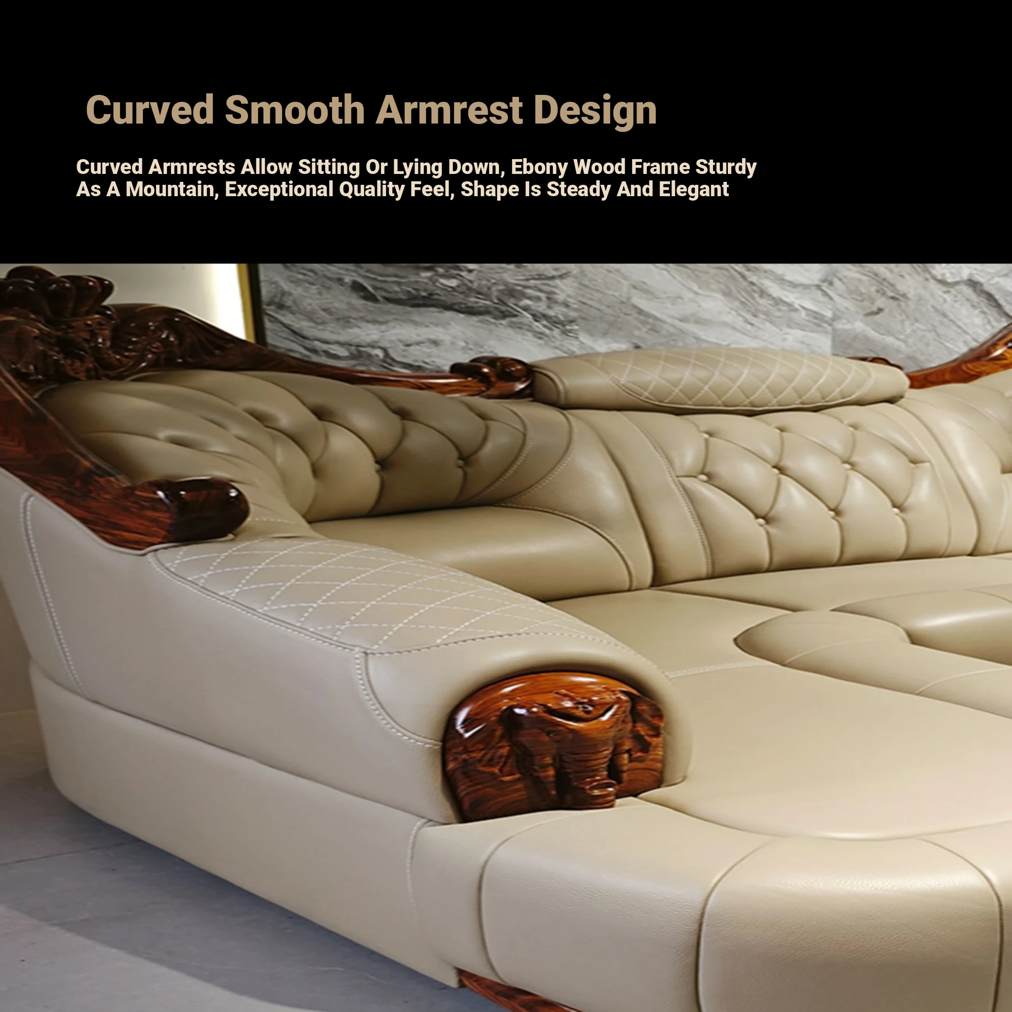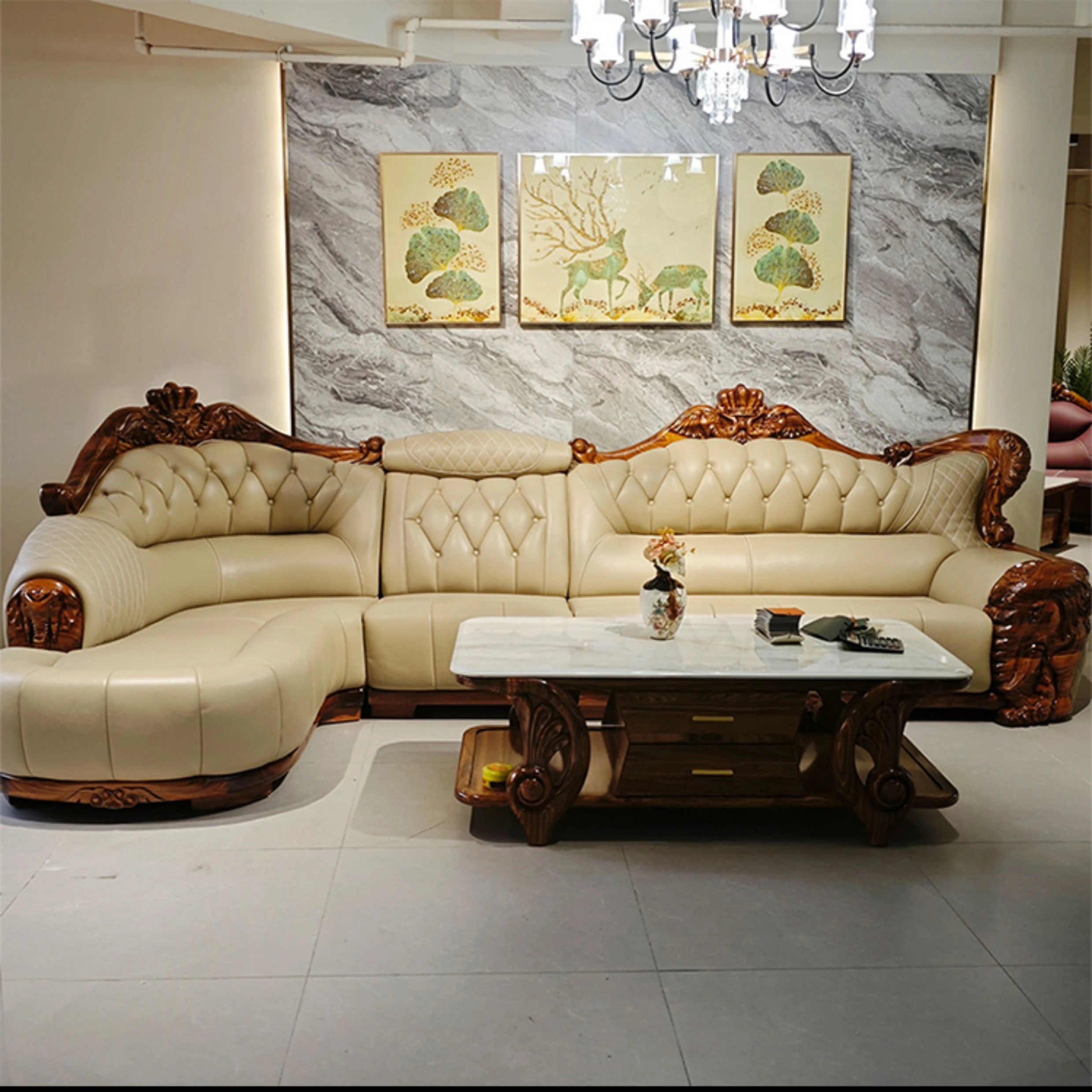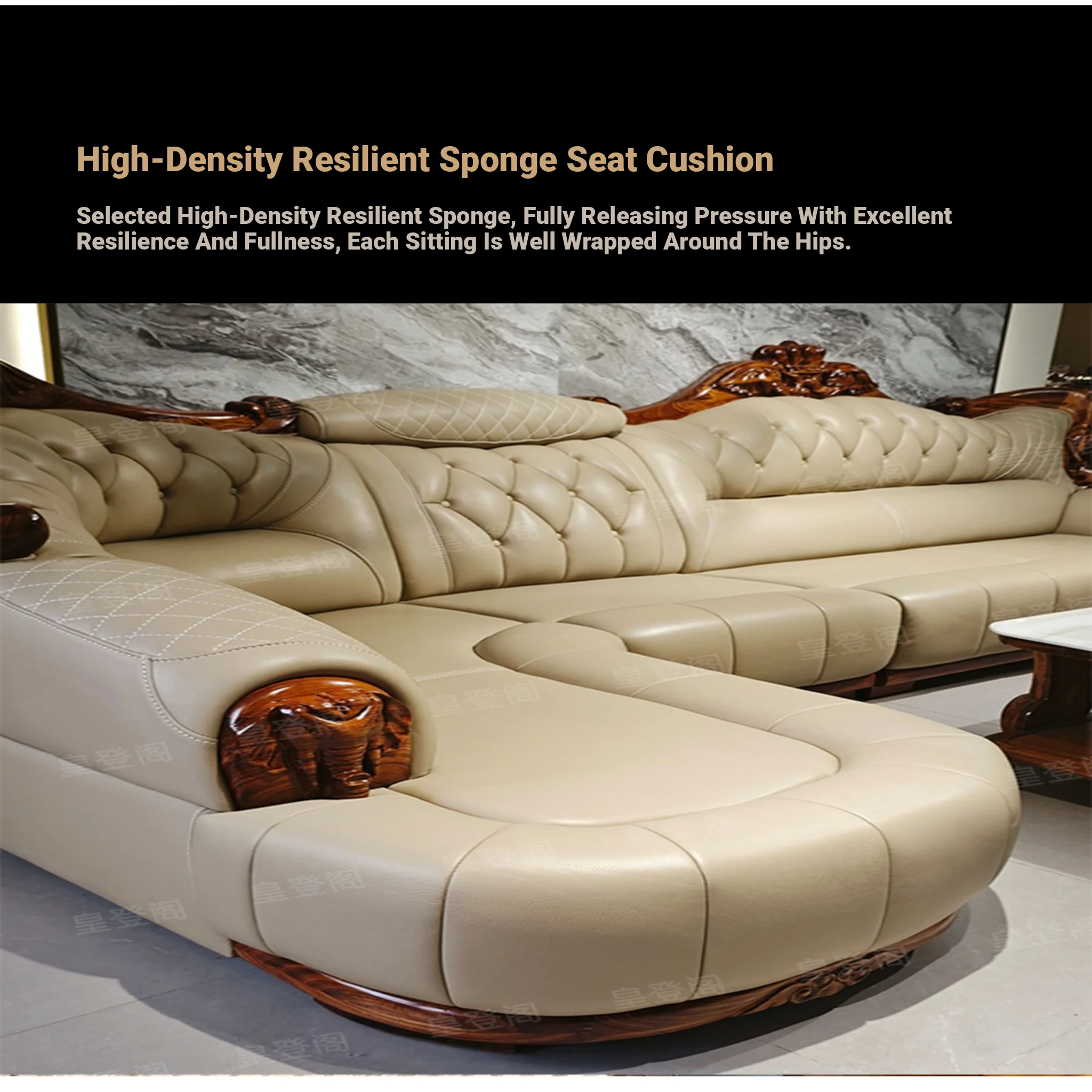 Luxury Chinese-style Solid Wood Elephant Crown Corner Sofa for Large Homes - Elegant Villa Chaise Lounge with High-Quality Leather Upholstery