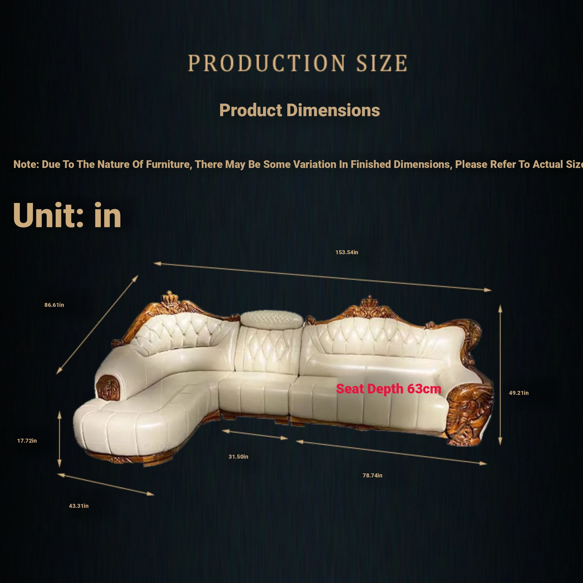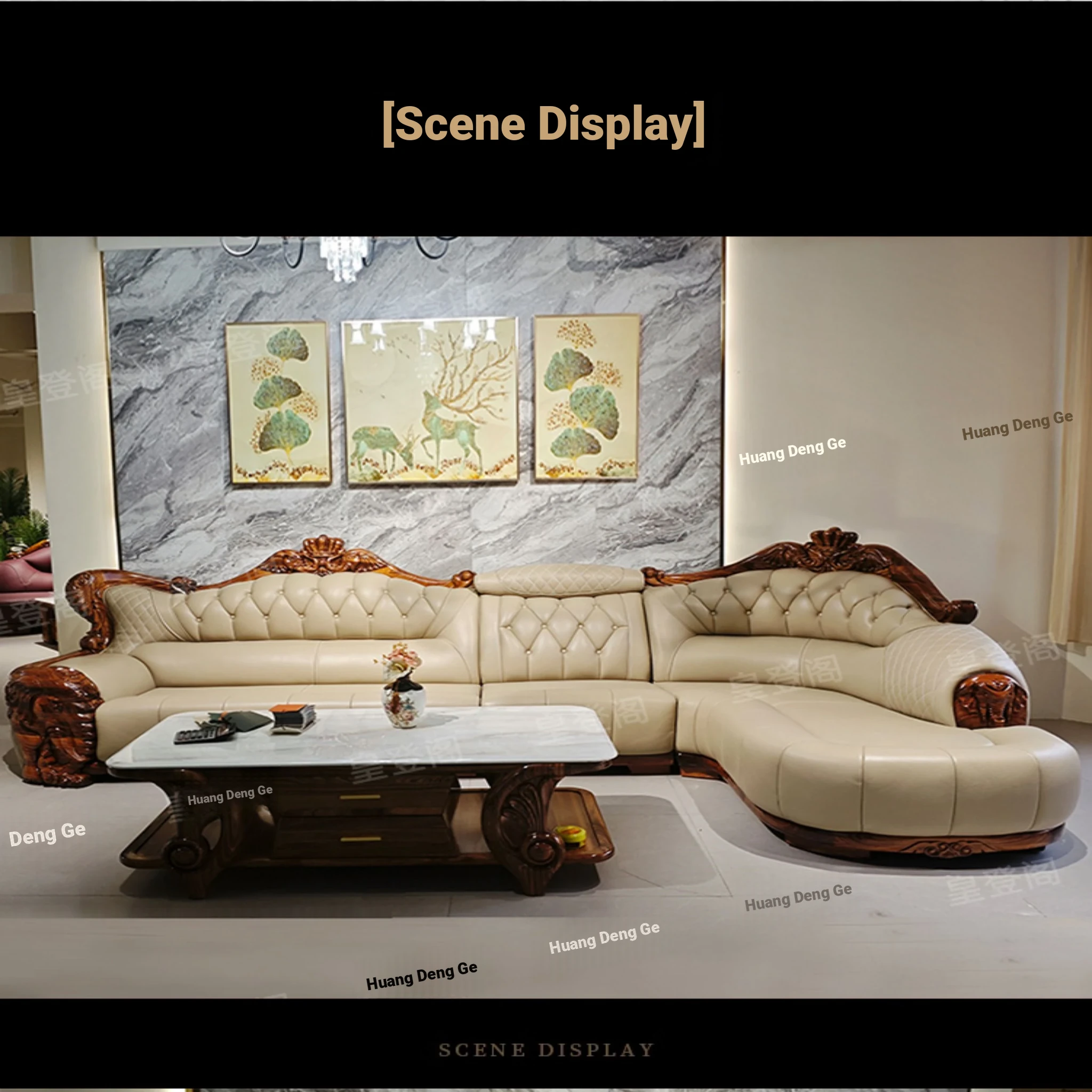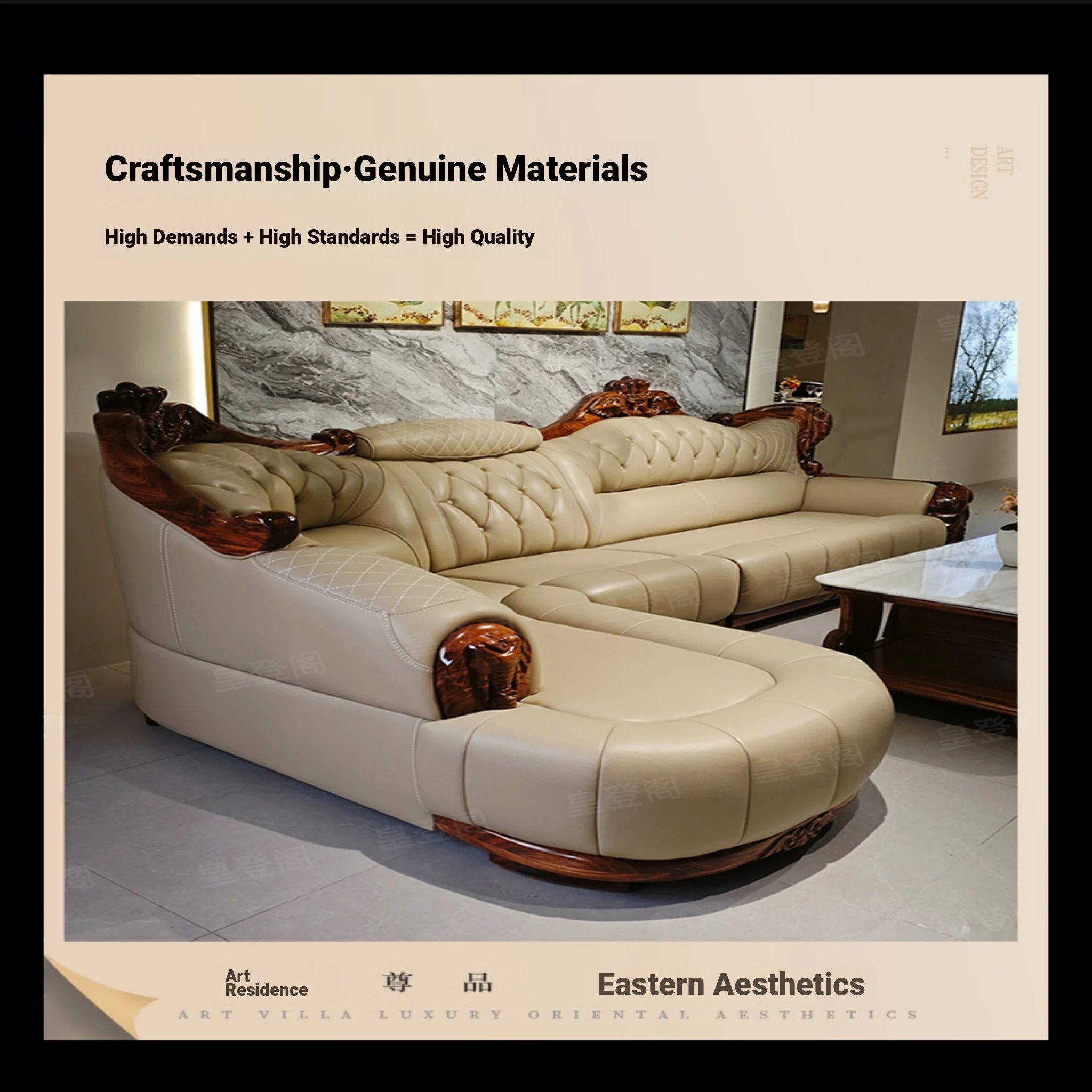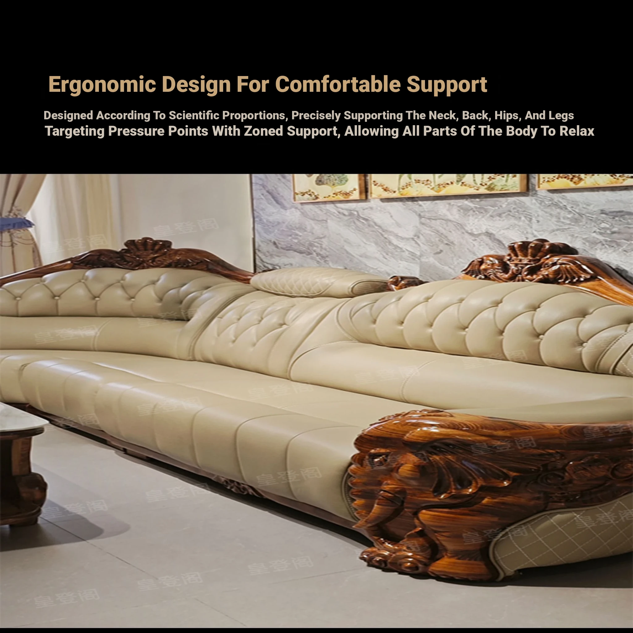 Luxury Chinese-style Solid Wood Elephant Crown Corner Sofa for Large Homes - Elegant Villa Chaise Lounge with High-Quality Leather Upholstery
