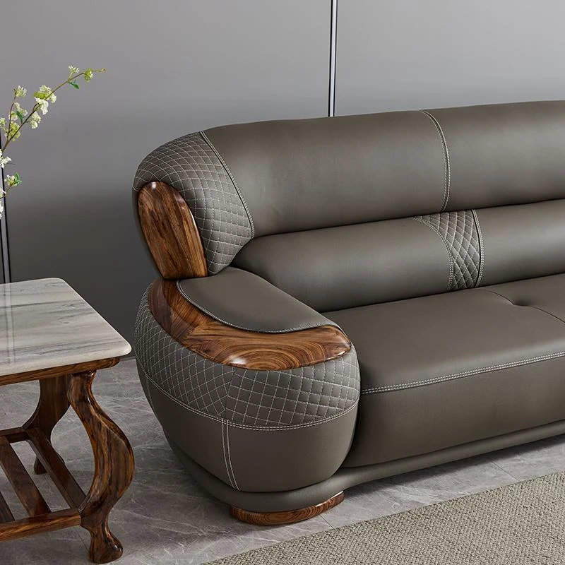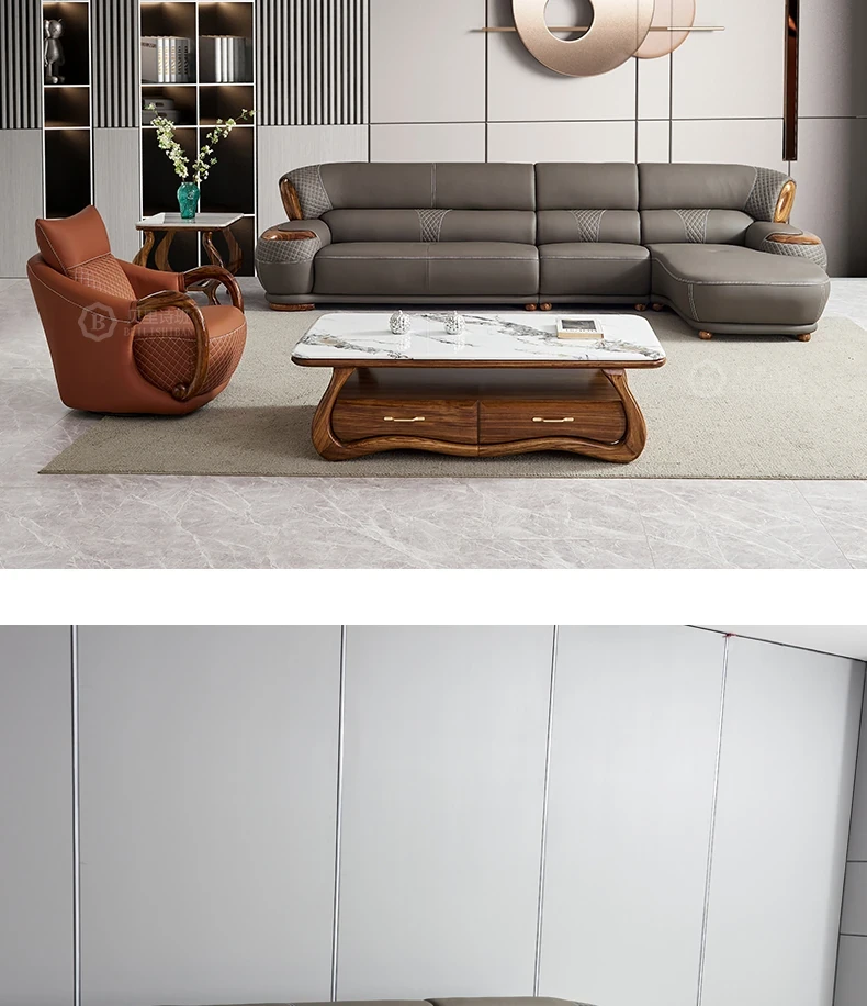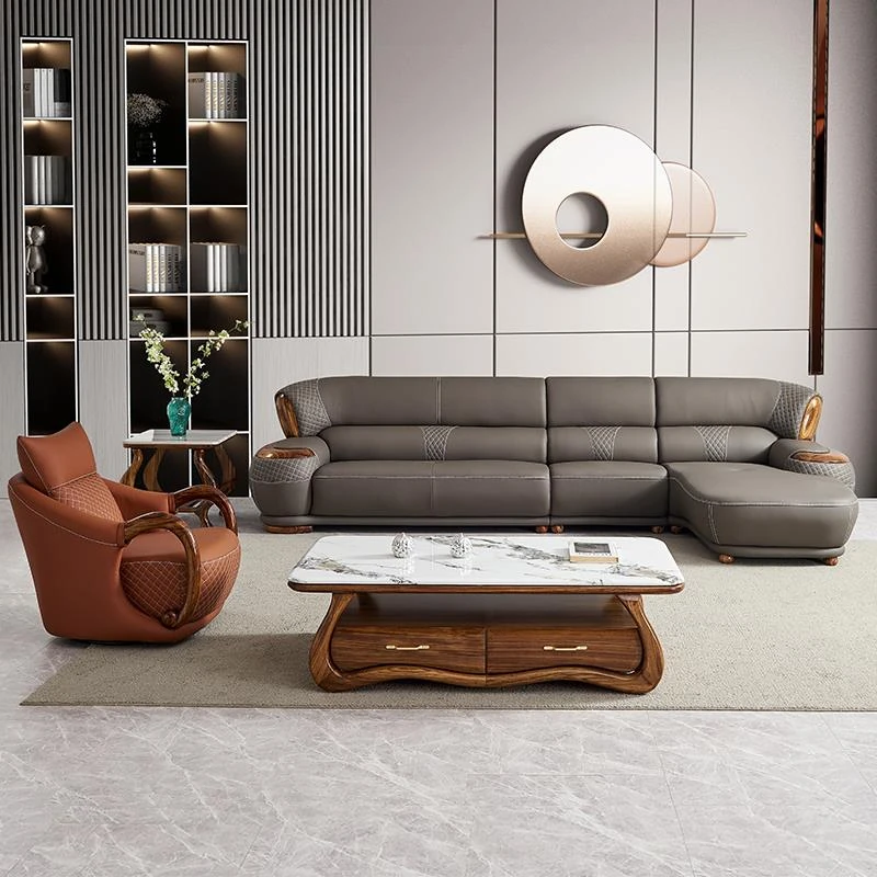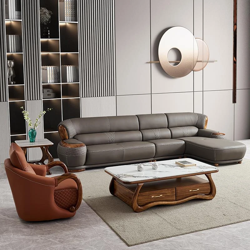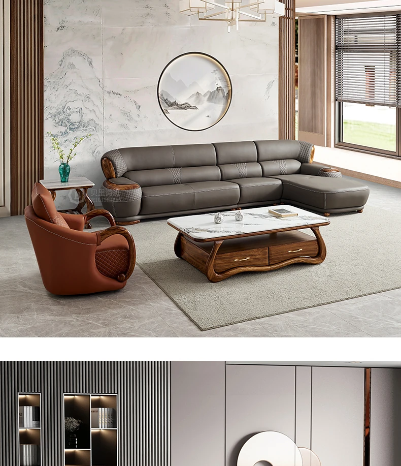 Modern Chinese-Style Genuine Leather Sofa with Ukin Wood - Minimalist Corner Sofa in Top-Grain Cowhide and Solid Wood for the Living Room - New 2024 Collection