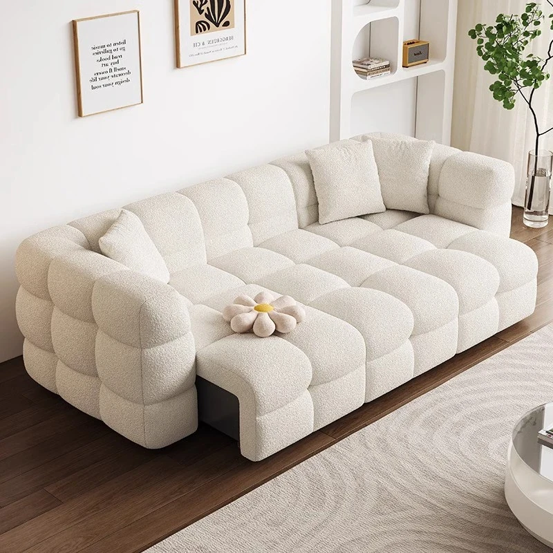 Trendy Electric Multifunctional Sofa Bed in Cream Fabric - Modern Adjustable Cotton Candy Lamb Fleece for Your Living Room! Perfect for Comfort and Style!