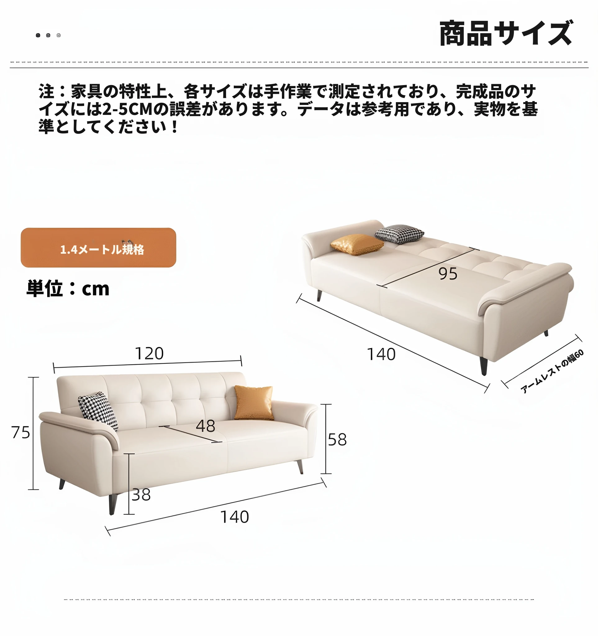 二人用 1.4メートル アイボリー【三防キャットクロー皮】スポンジタイプ