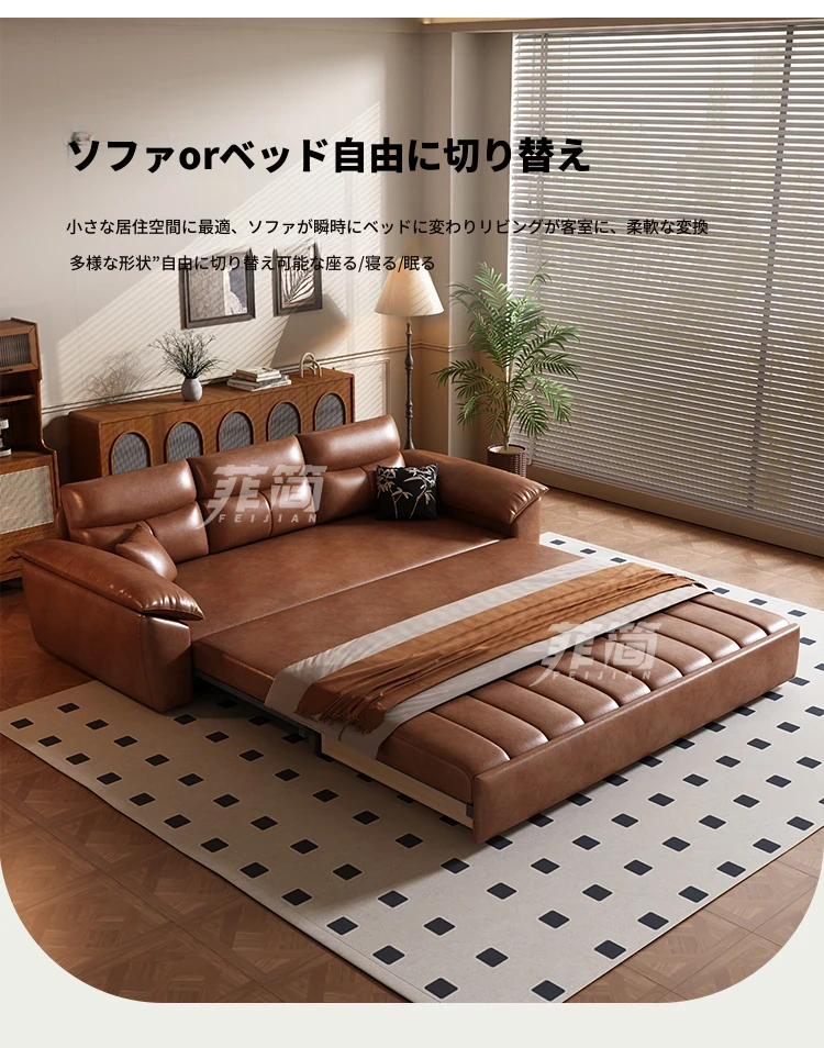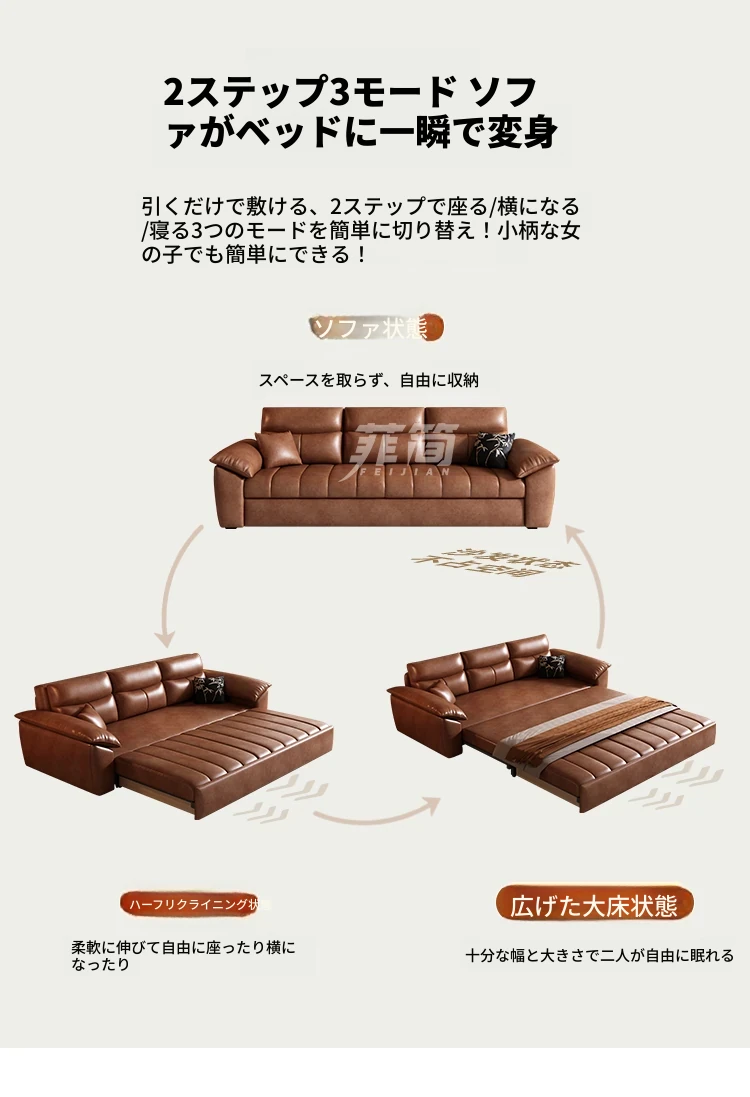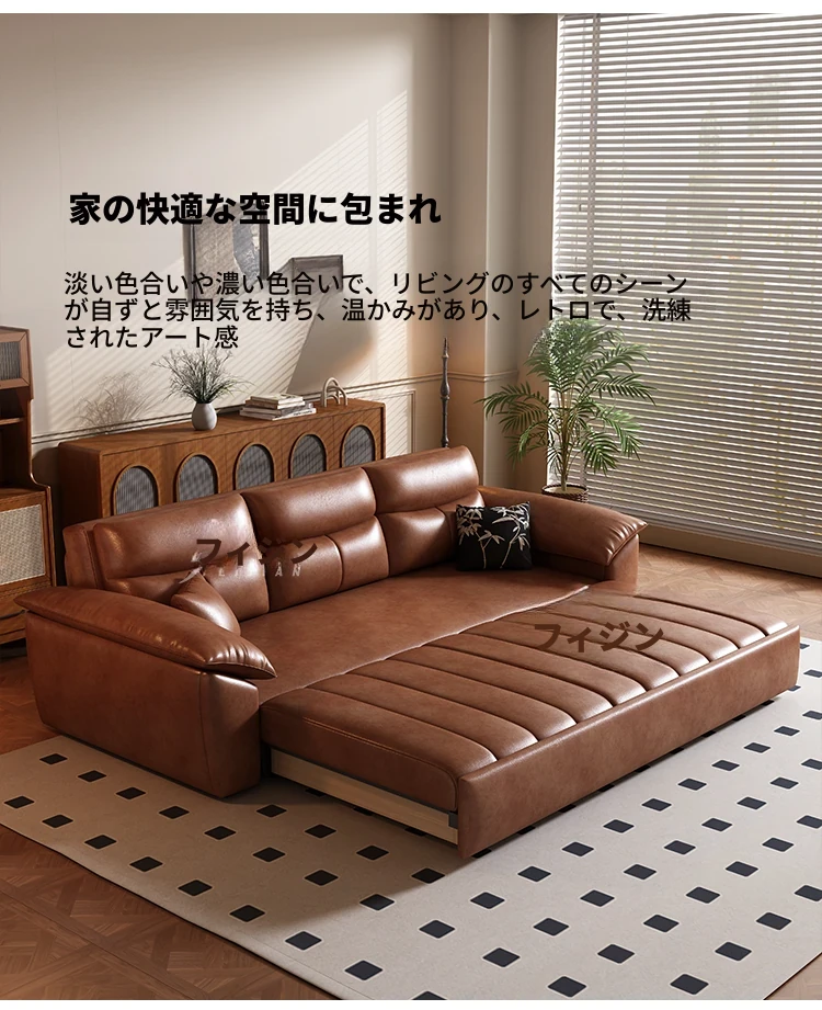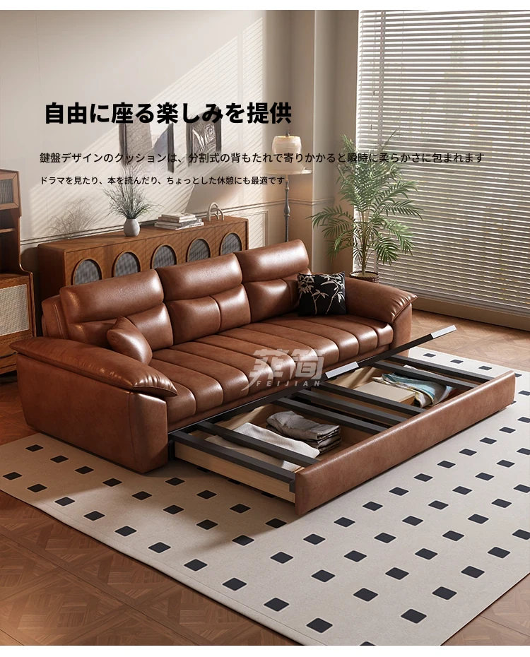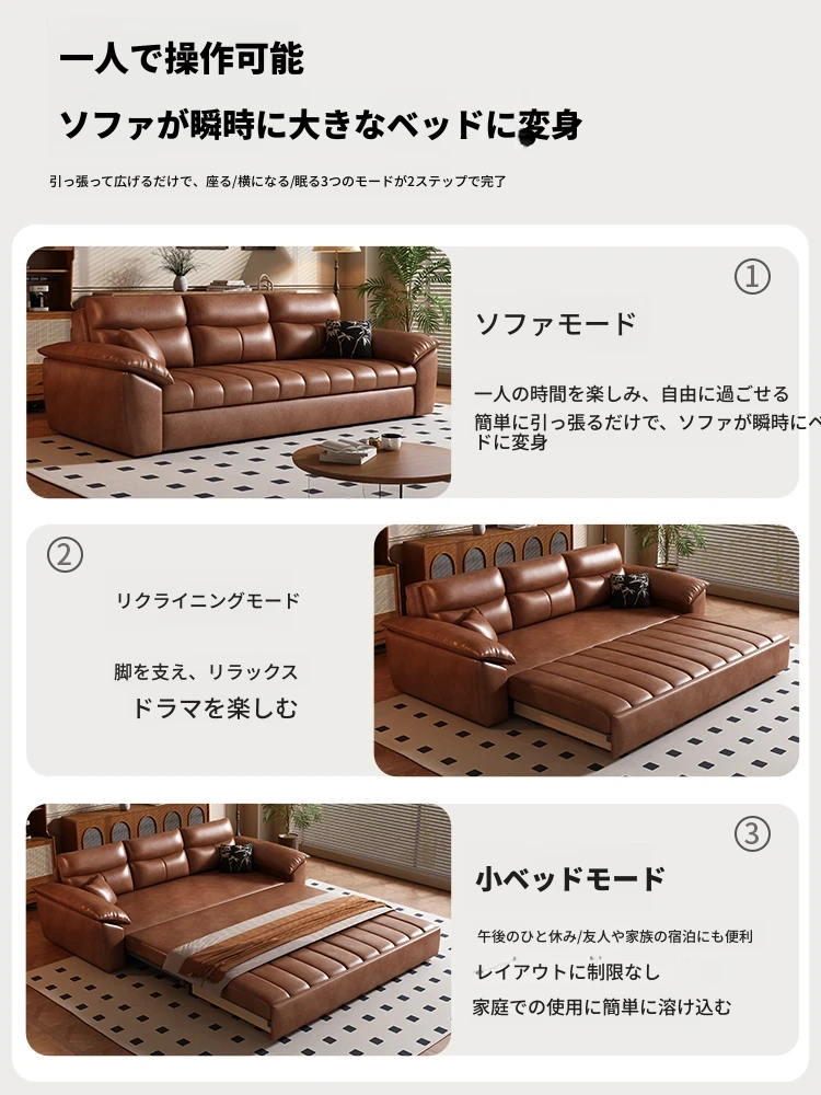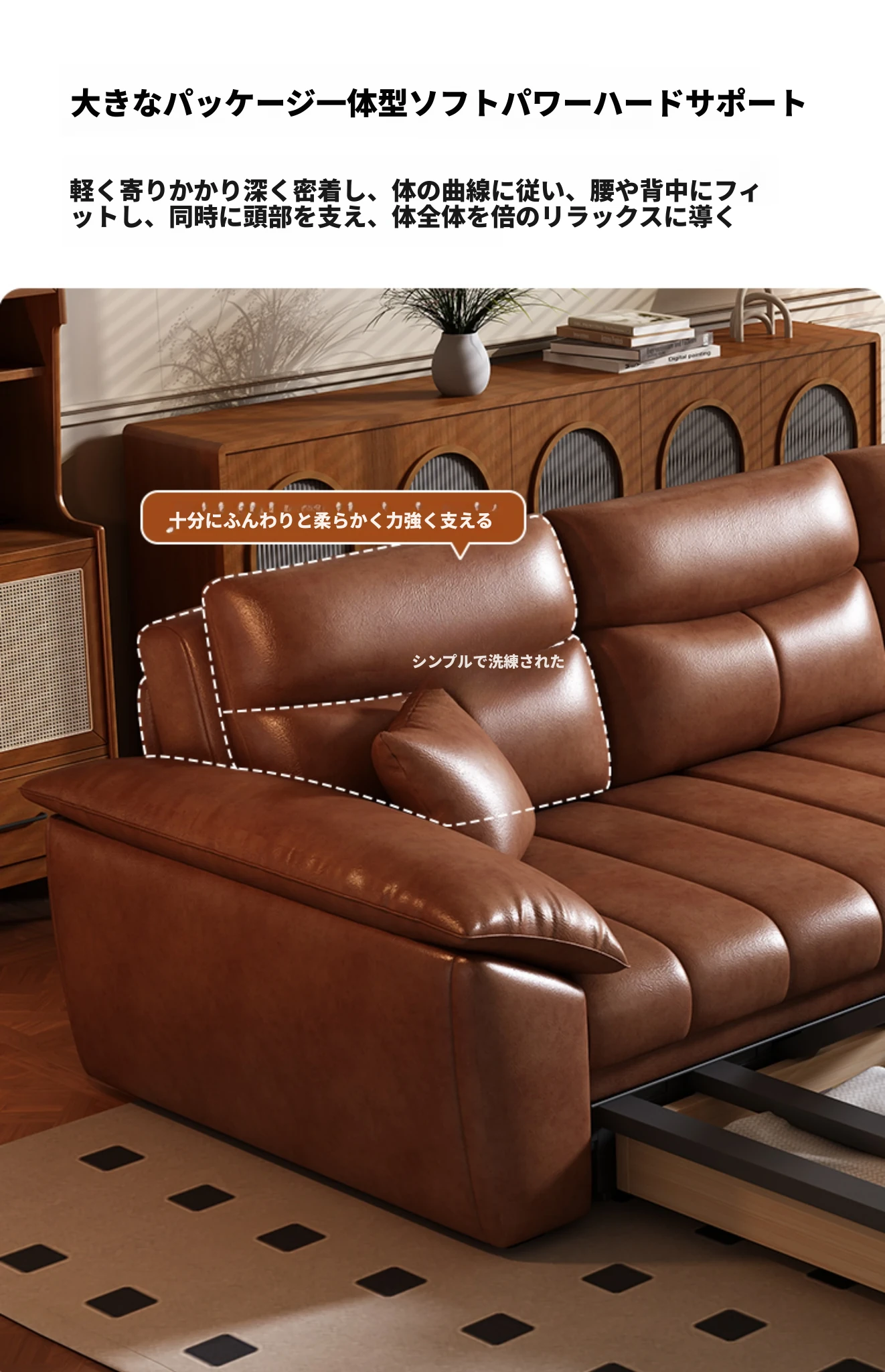 2025年新作!高級リアルレザー使用の木製引き出し式ソファベッド - 折りたたみ2WAYデザインで、リビングにぴったりなスタイリッシュな一体型ソファベッド!快適な寝心地と洗練されたデザインを両立。