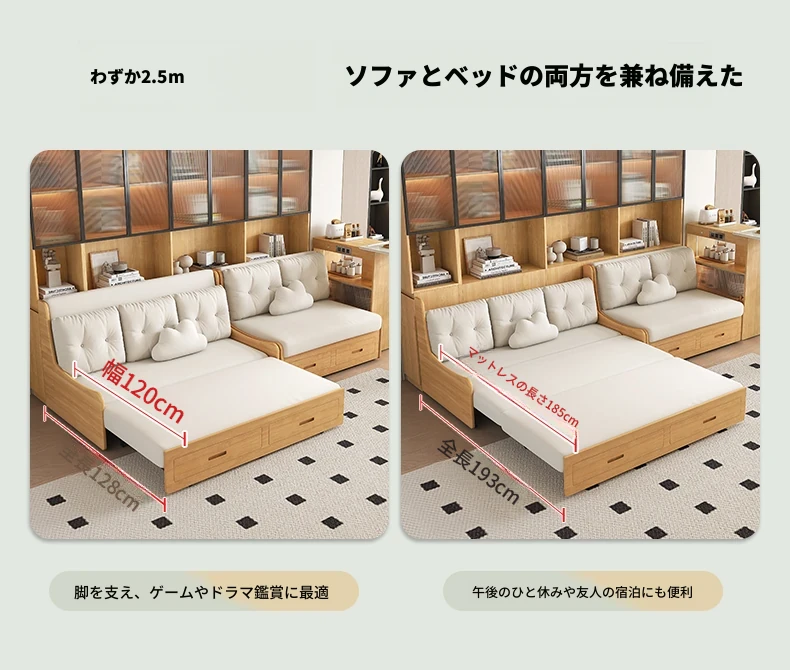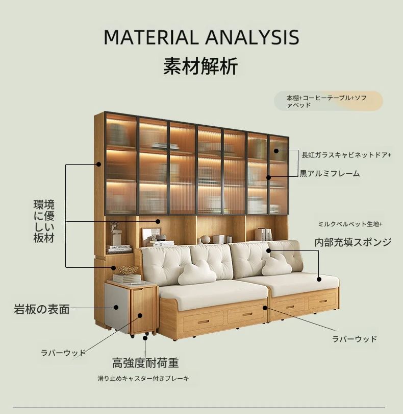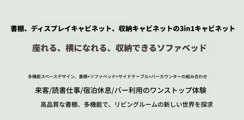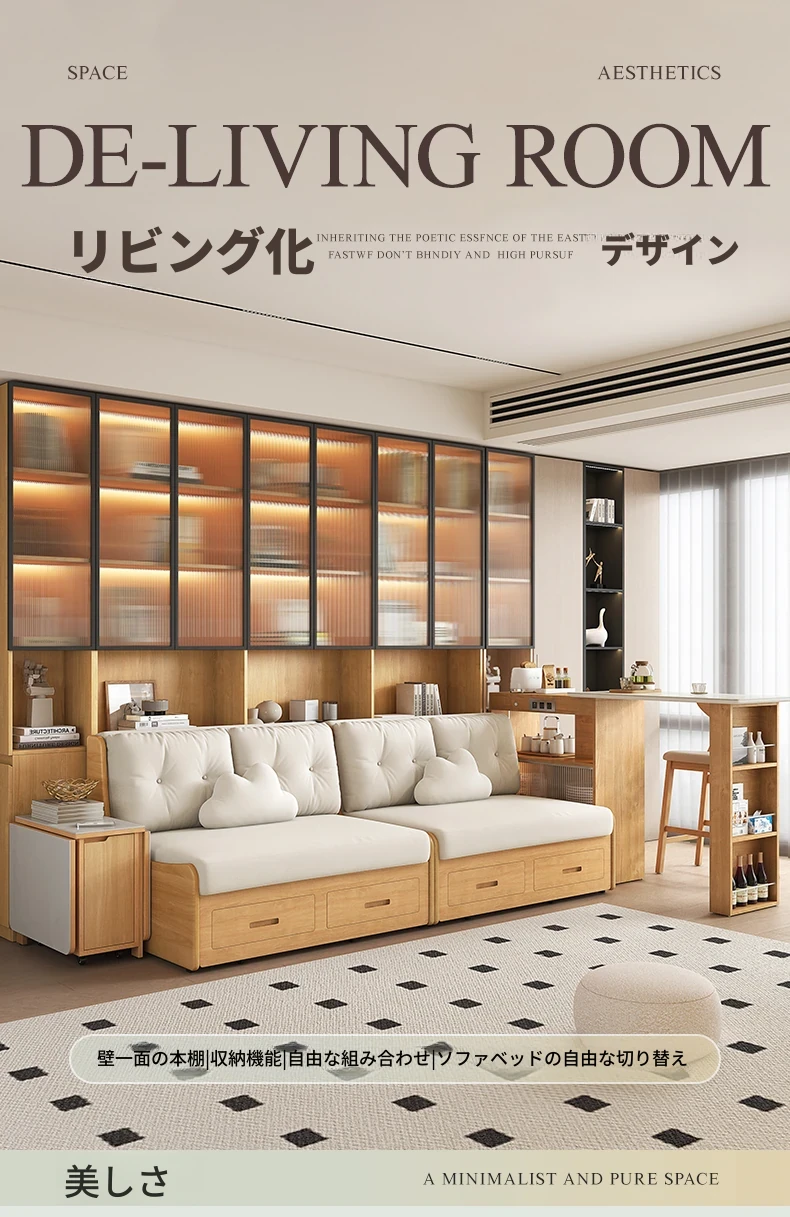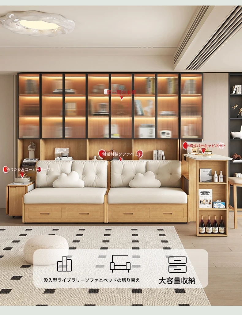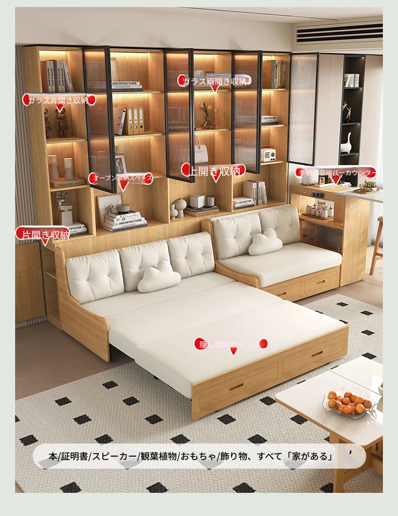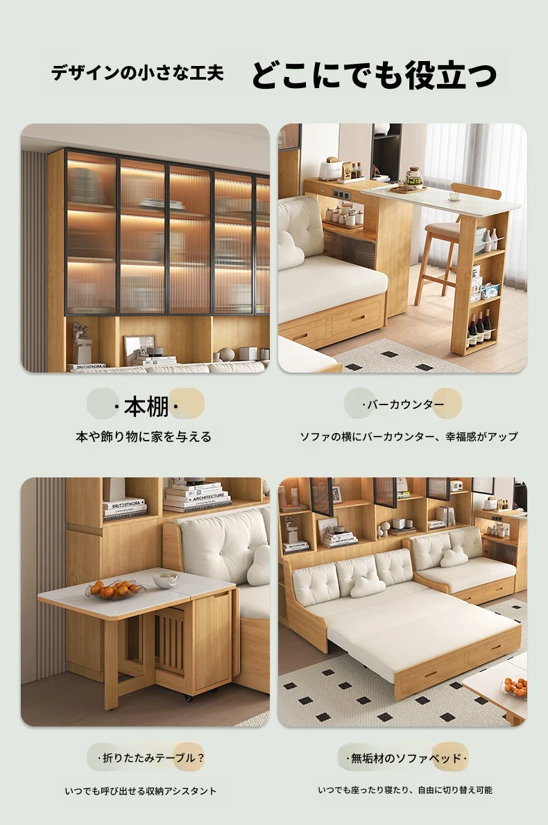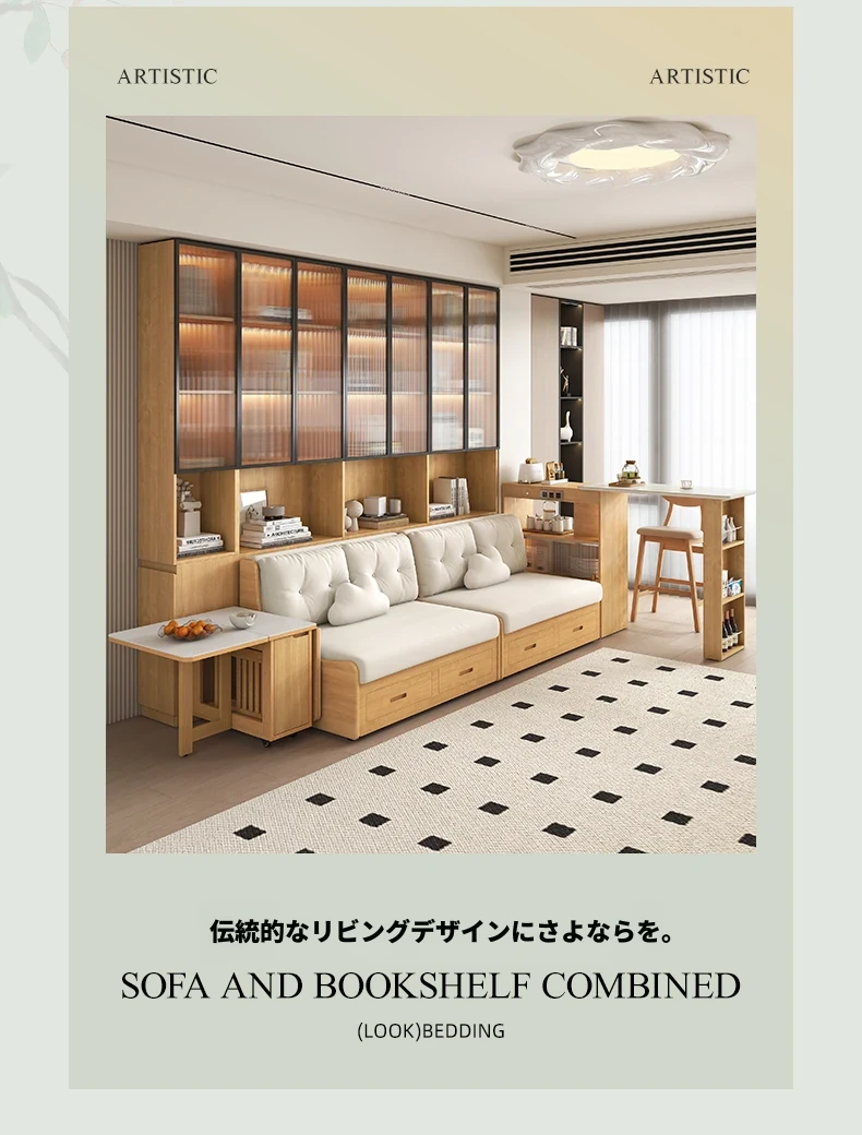 小スペースに最適!リビング用の天然木製ソファベッド、折りたたみ式で多機能。収納付き書棚と一体化したコンパクトなサイドキャビネットセット。おしゃれで機能的な空間を実現します!