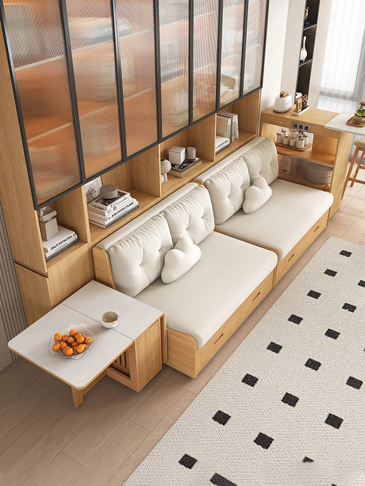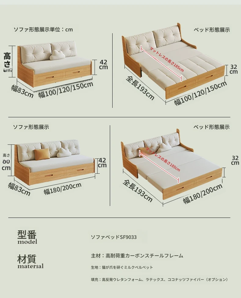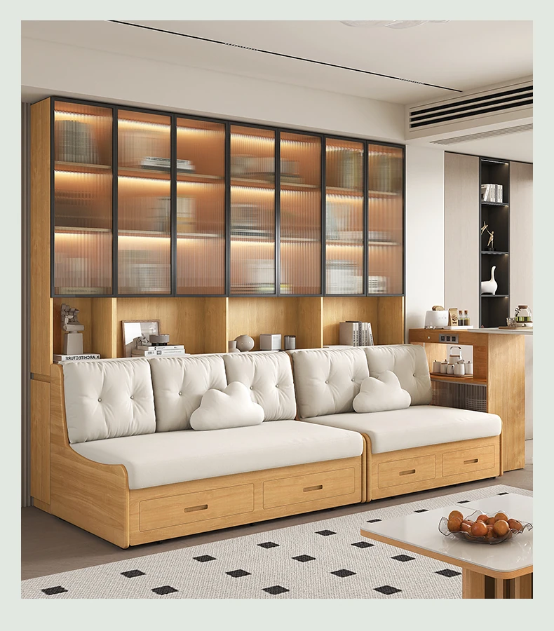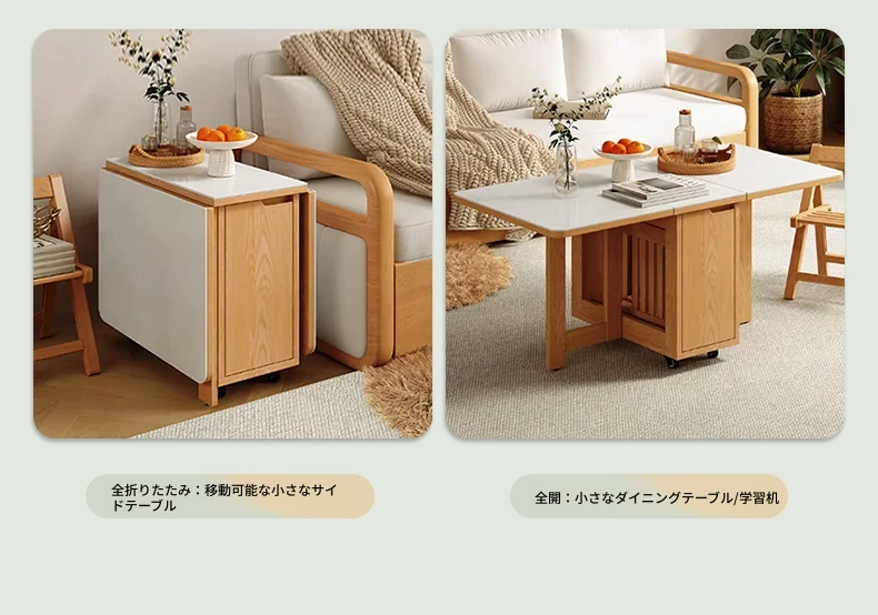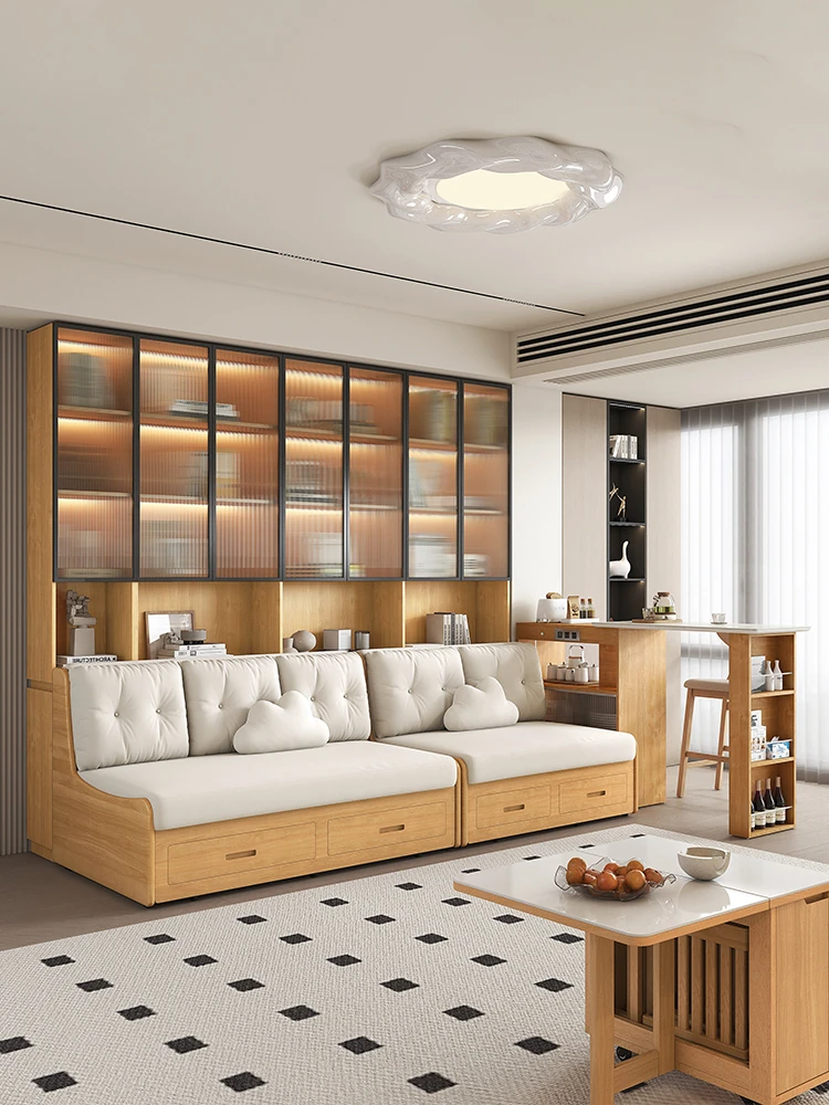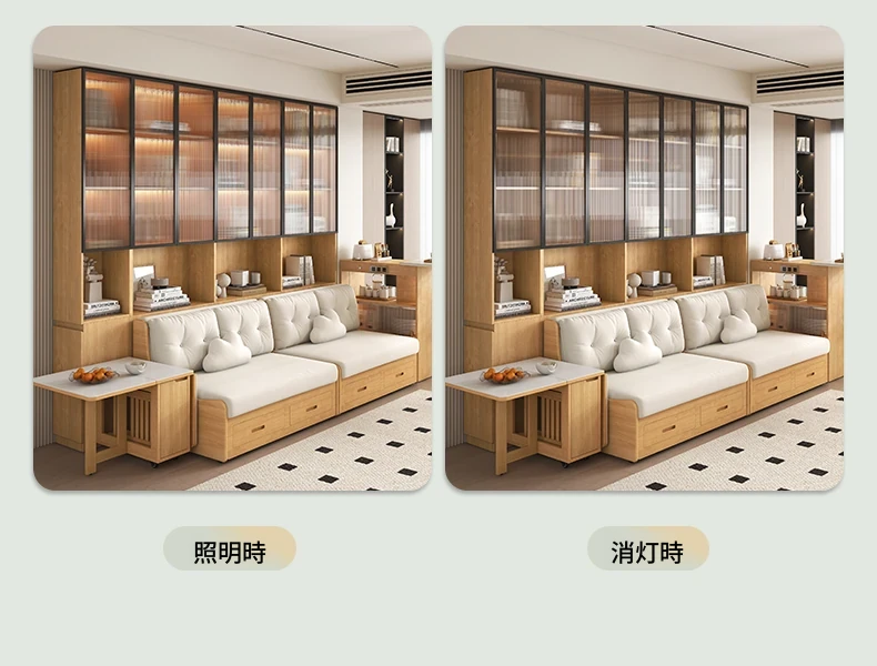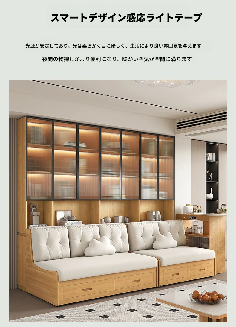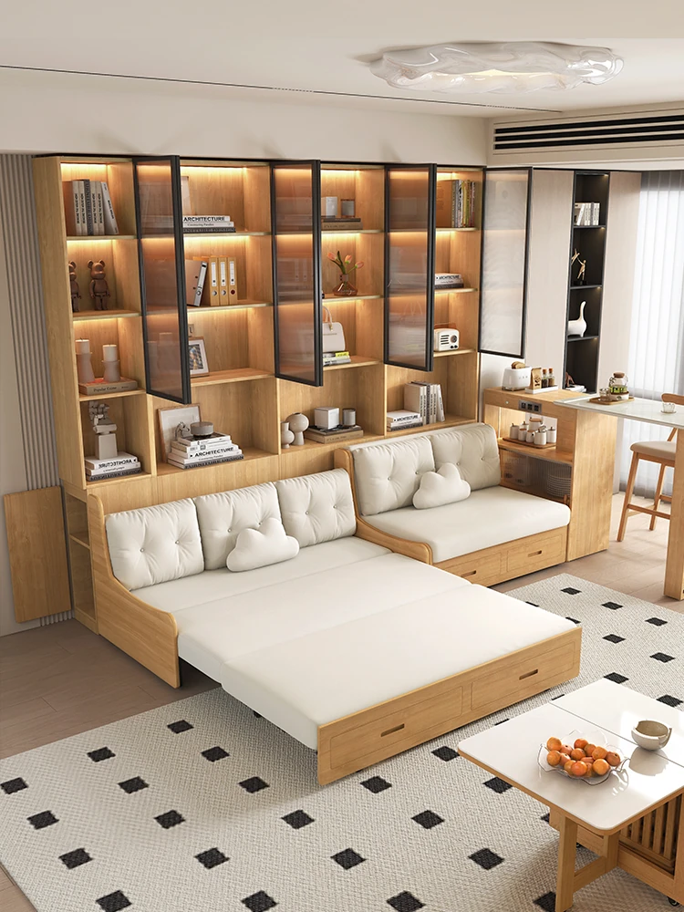 小スペースに最適!リビング用の天然木製ソファベッド、折りたたみ式で多機能。収納付き書棚と一体化したコンパクトなサイドキャビネットセット。おしゃれで機能的な空間を実現します!