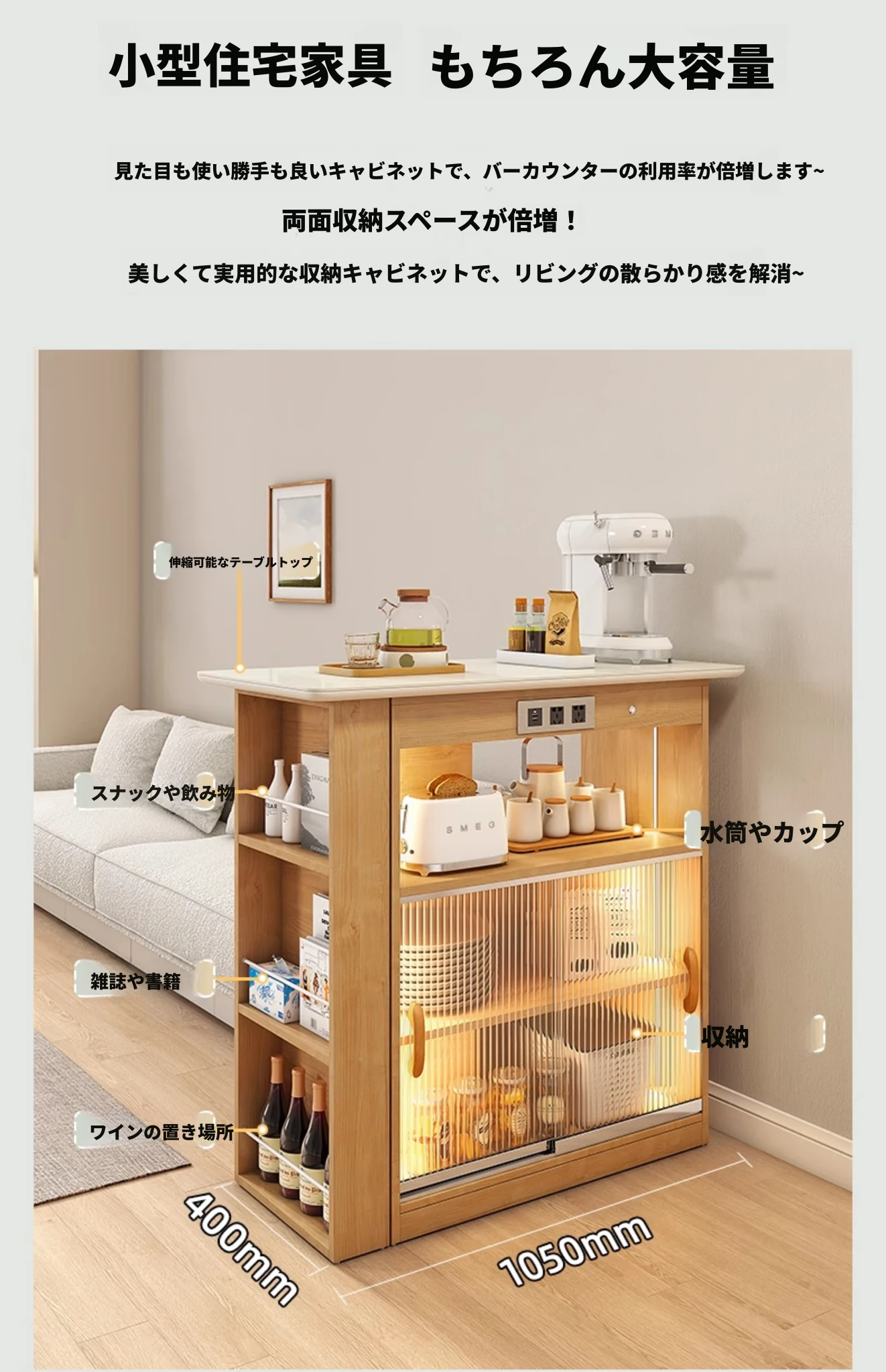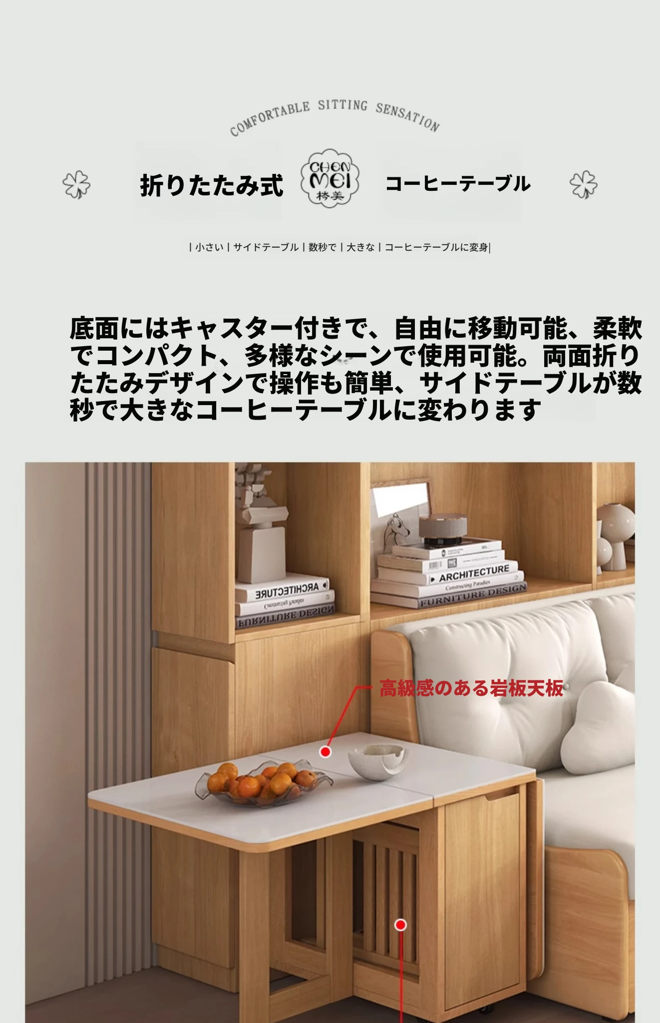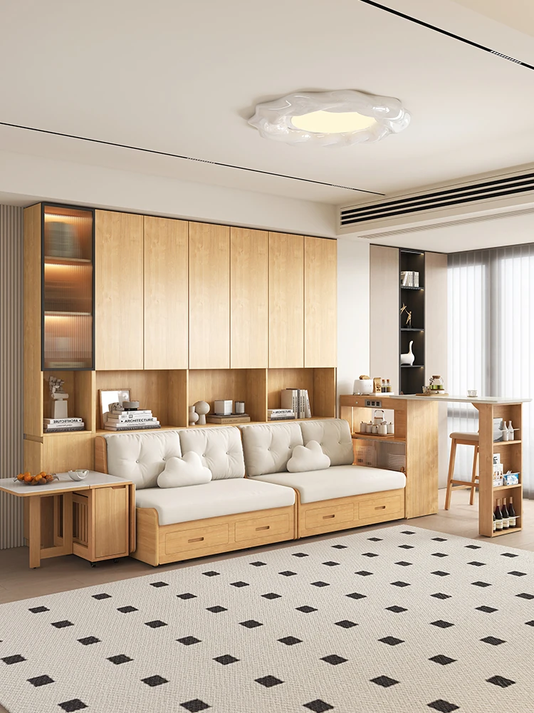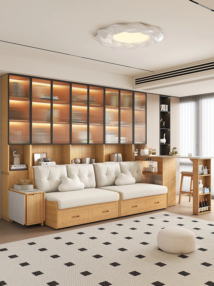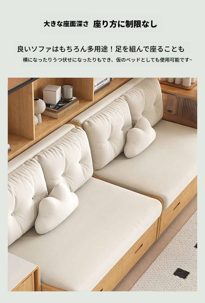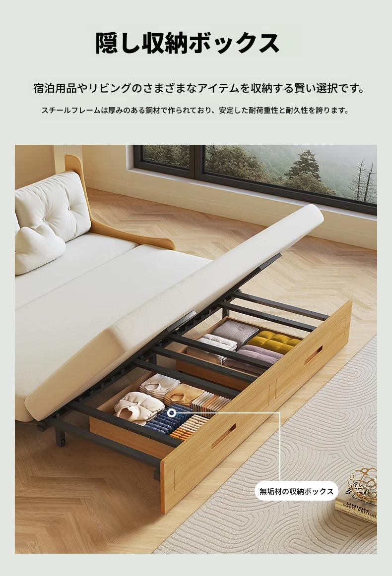 小スペースに最適!リビング用の天然木製ソファベッド、折りたたみ式で多機能。収納付き書棚と一体化したコンパクトなサイドキャビネットセット。おしゃれで機能的な空間を実現します!