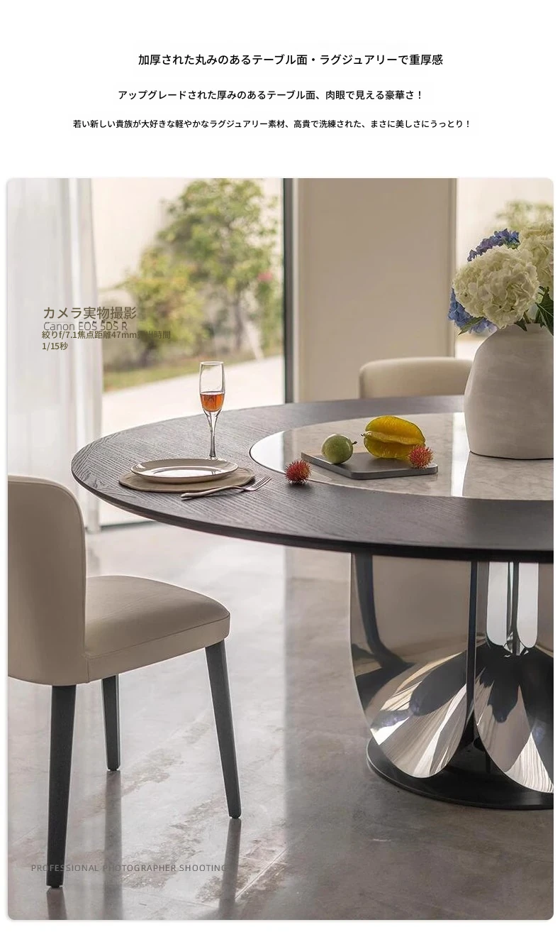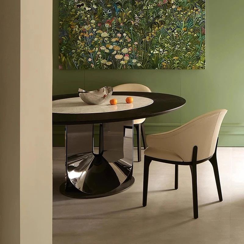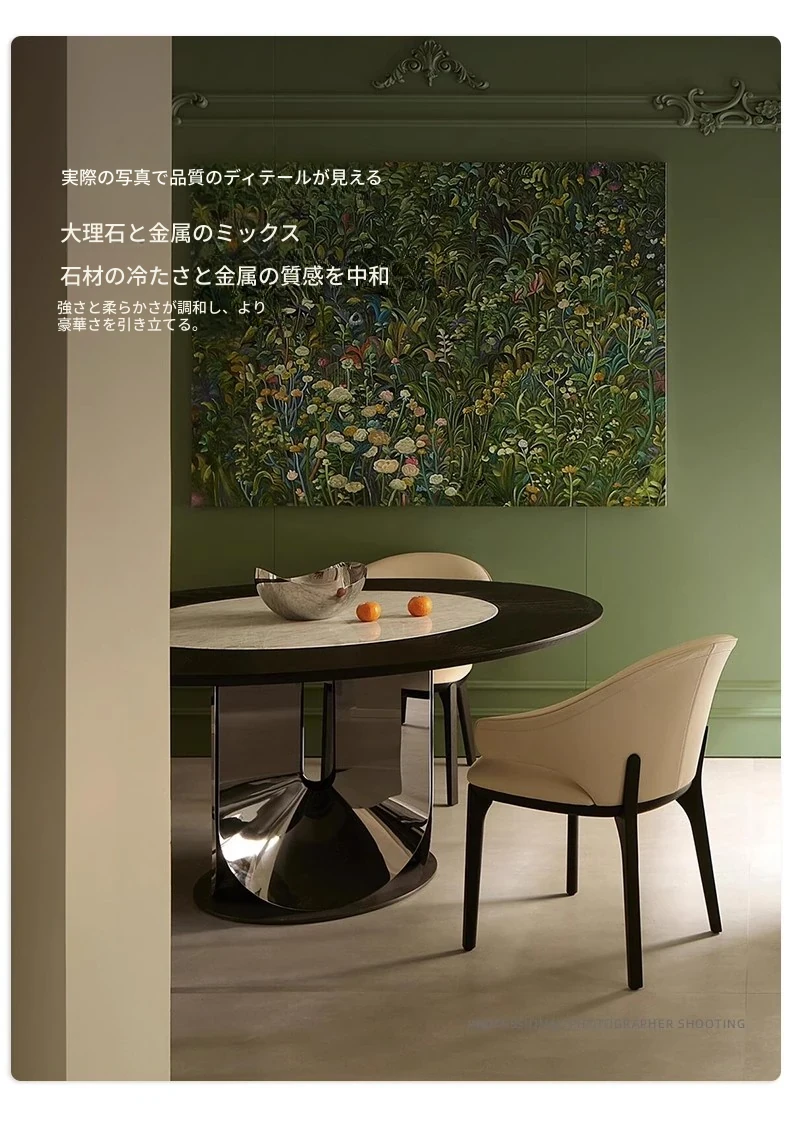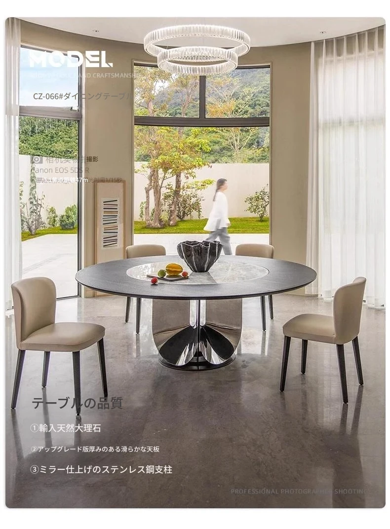イタリアンミニマリズムの無垢材と大理石を組み合わせたラウンドダイニングテーブル、ステンレスミラー仕上げで高級感を演出。別荘にぴったりの洗練されたデザイン!