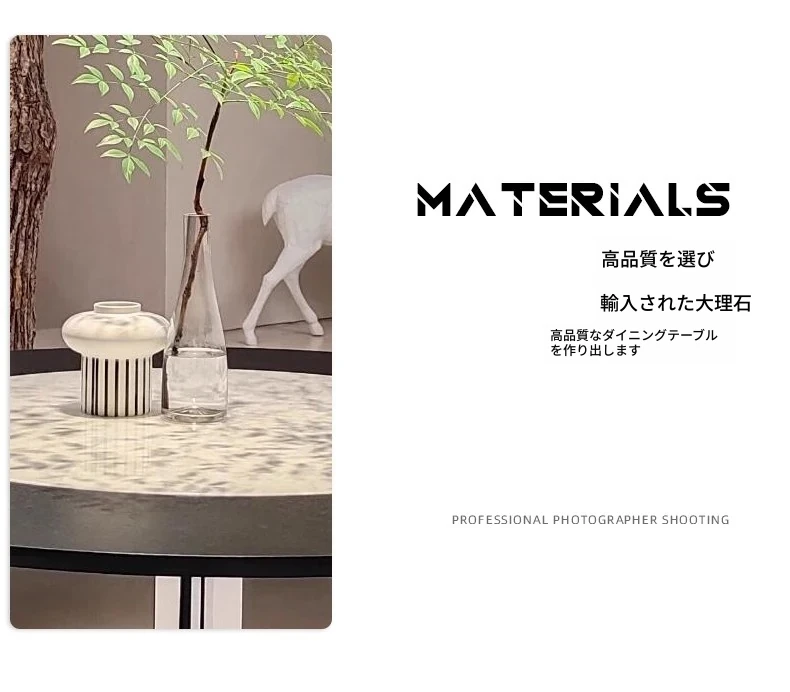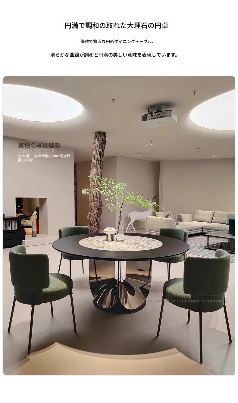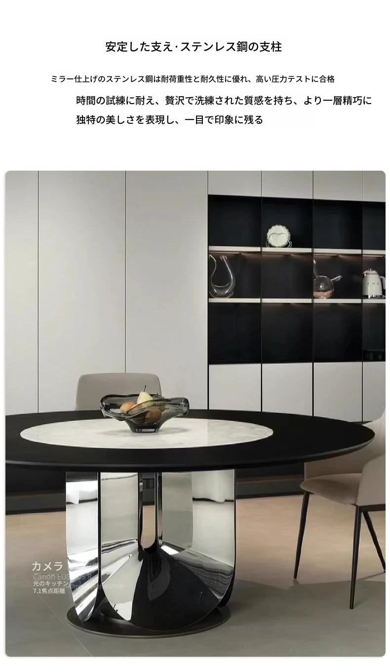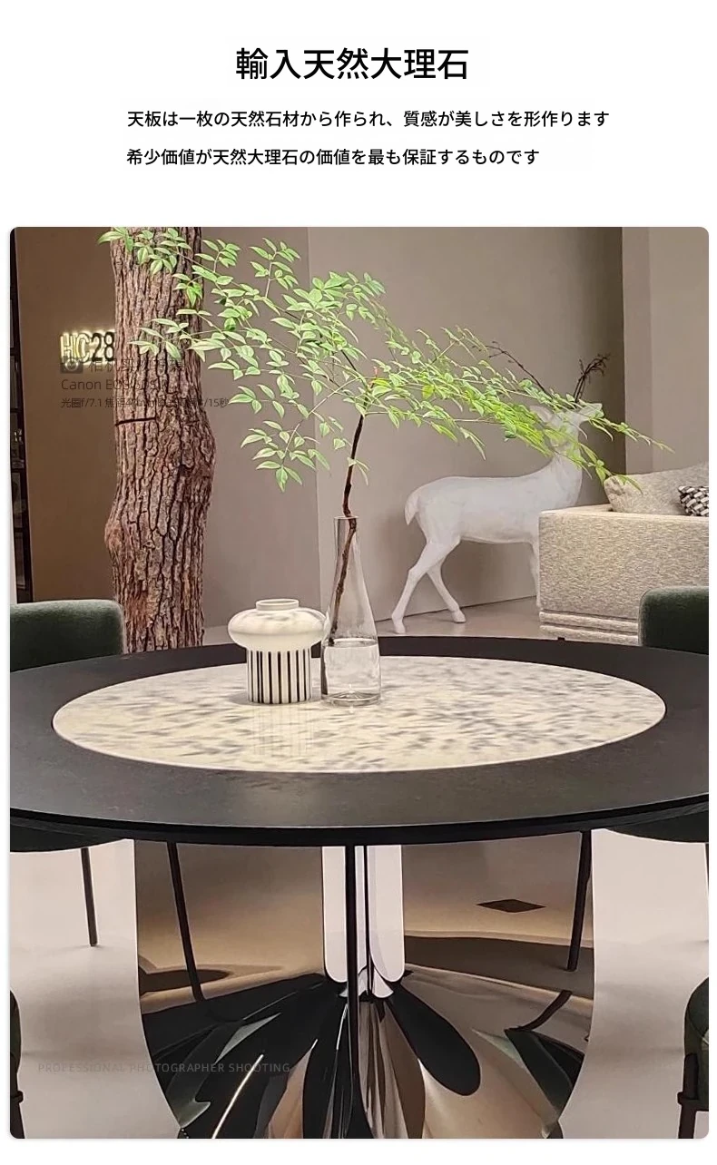イタリアンミニマリズムの無垢材と大理石を組み合わせたラウンドダイニングテーブル、ステンレスミラー仕上げで高級感を演出。別荘にぴったりの洗練されたデザイン!