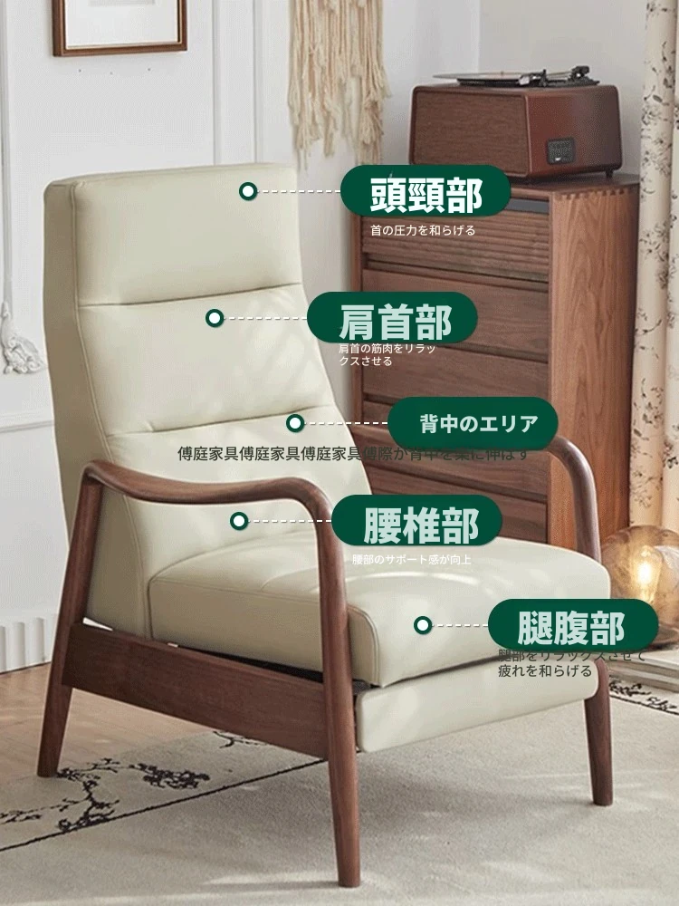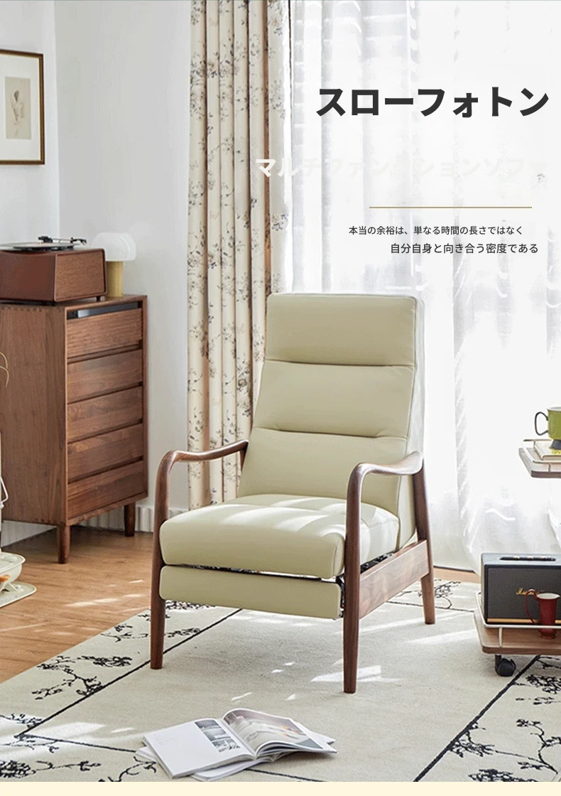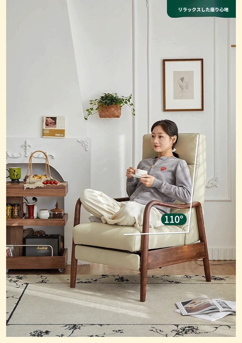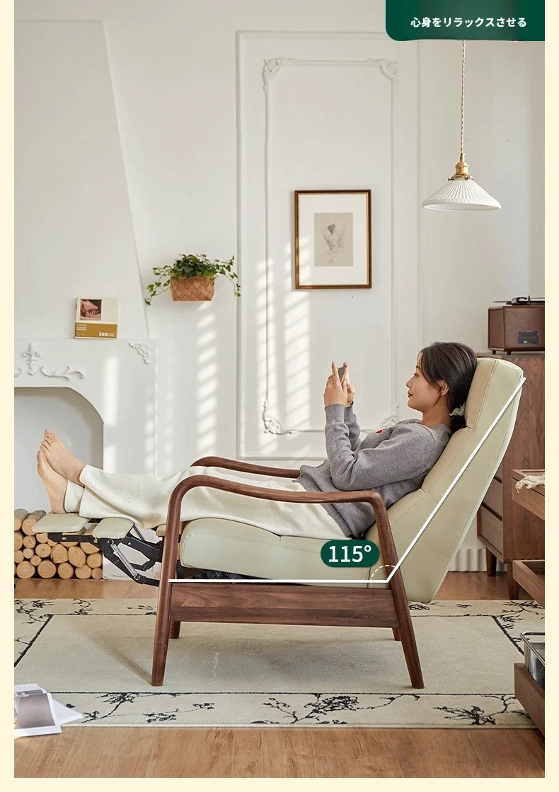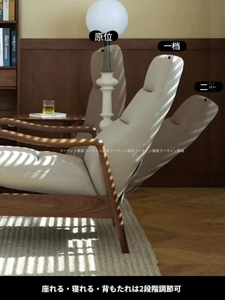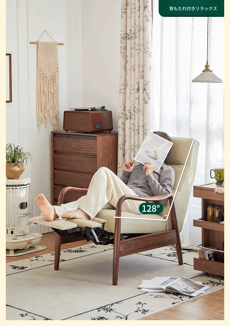 北米産ブラックウォールナットの多機能リクライニングソファチェア - リラックスできる一人用、座り心地抜群の調整可能なウッドアームチェア!快適なひとときをあなたに。