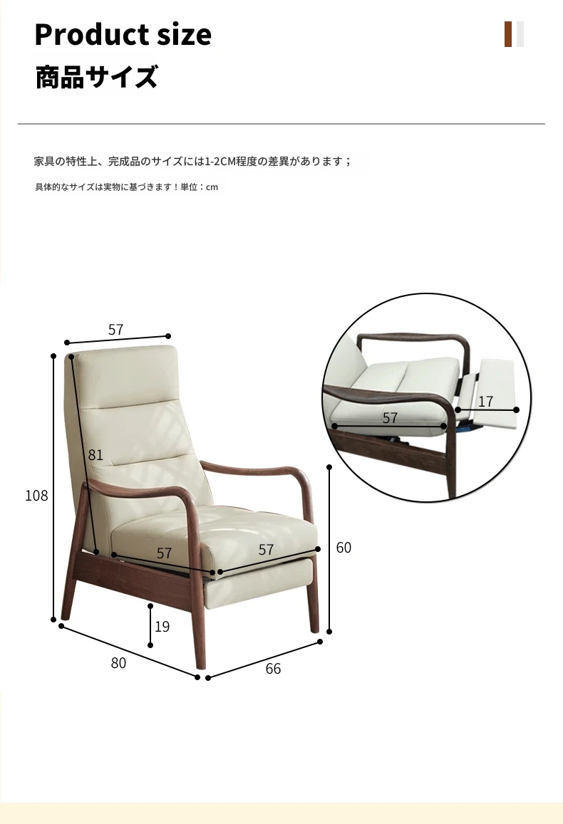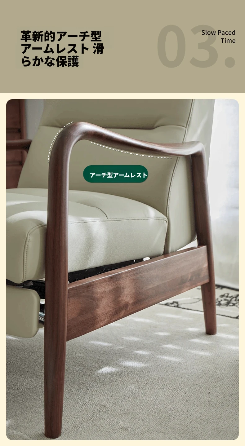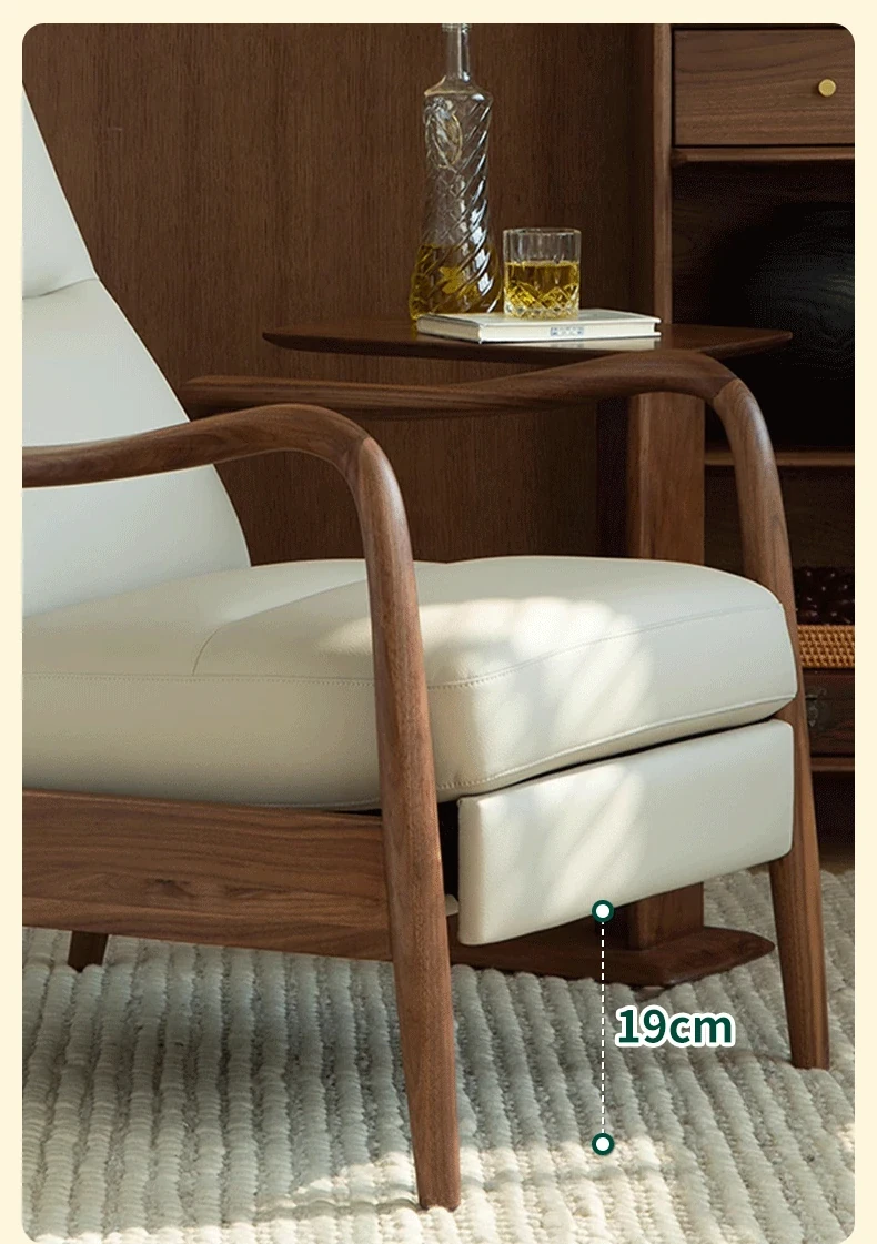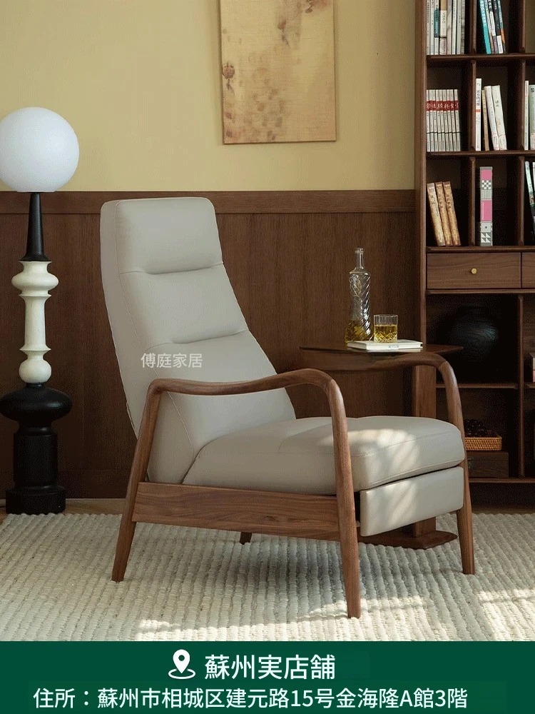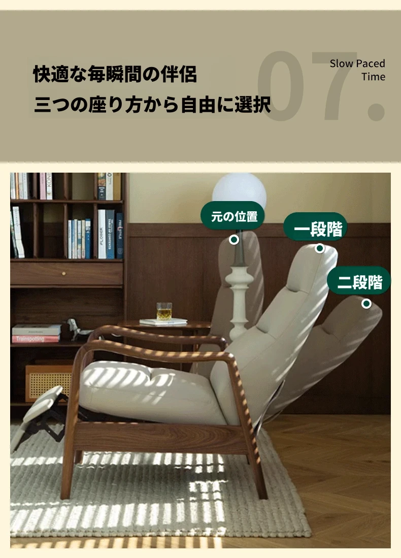北米産ブラックウォールナットの多機能リクライニングソファチェア - リラックスできる一人用、座り心地抜群の調整可能なウッドアームチェア!快適なひとときをあなたに。