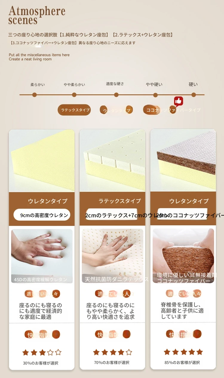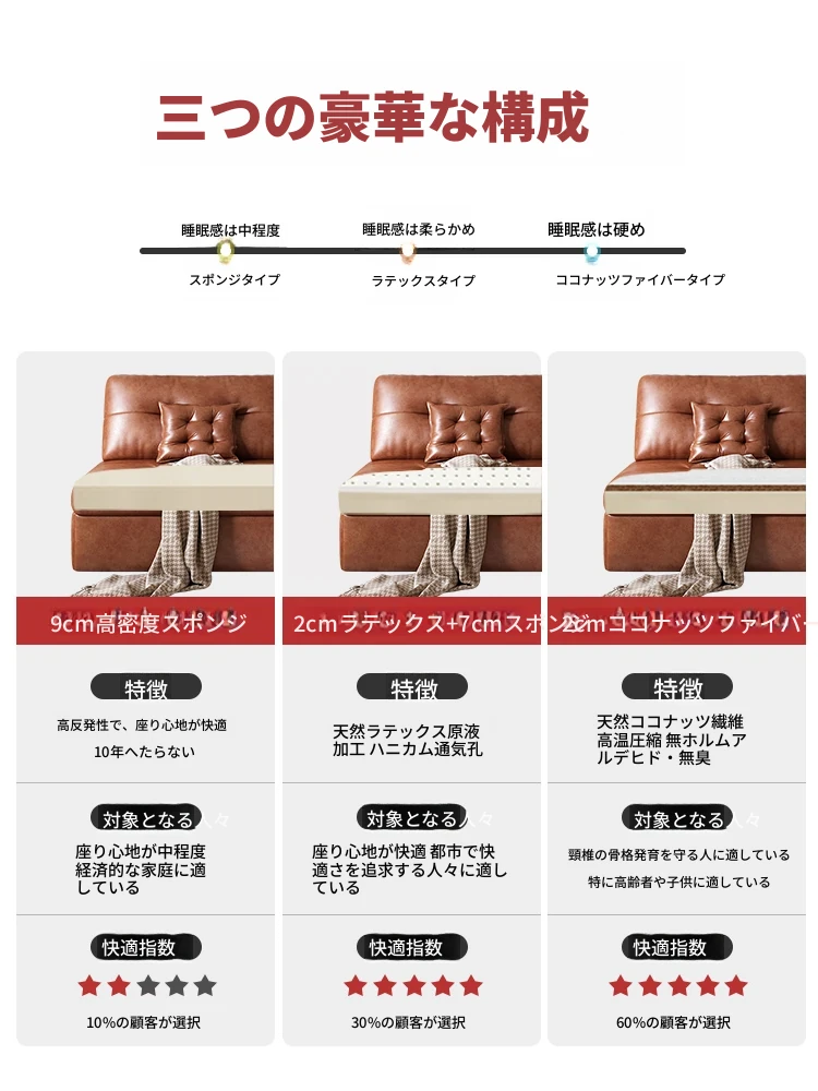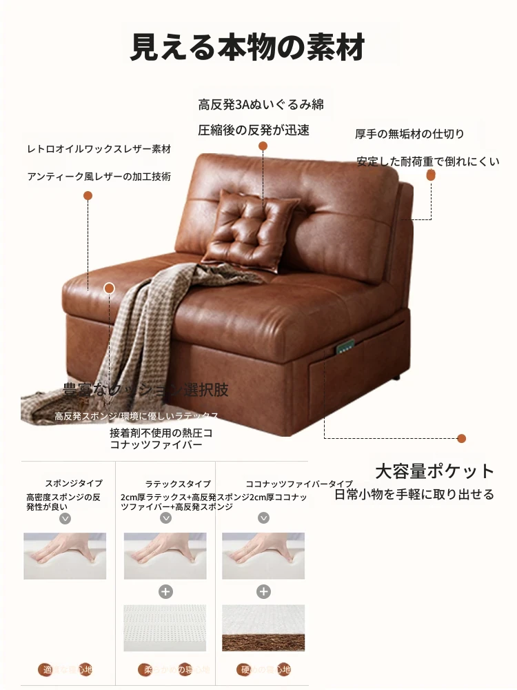 (脊椎を守る効果)0.8mソファベッド【環境保護ココナッツファイバータイプ|レトロオイルワックス本革】